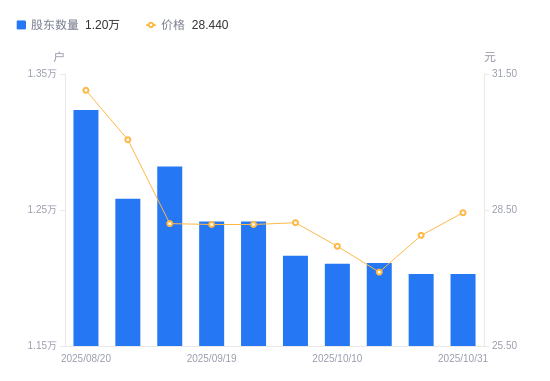 日期A股户数(户)流通A股户均持股数(股)户均持股市值(万元)2025-10-31120303681.6410.472025-10-30120303681.6410.292025-10-20121103657.319.922025-10-10121053658.8210.132025-09-30121633641.3810.282025-09-20124162978.888.392025-09-19124162978.888.392025-09-10128202885.018.142025-08-29125832939.348.832025-08-20132352794.548.70