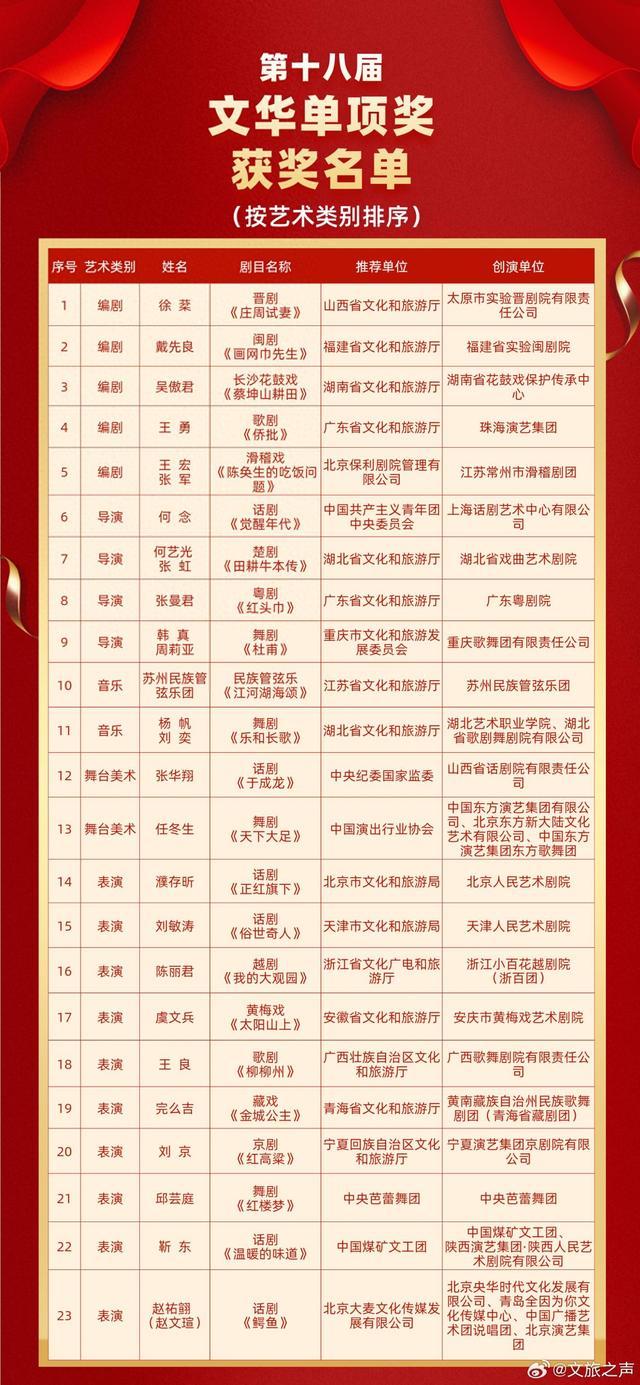 作为舞台艺术领域的政府最高奖,文华奖对于繁荣文艺创作,推出优秀作品和优秀人才方面发挥了重要作用。本届文华奖涵盖四个类别,分别是:文华剧目奖、文华节目奖、文华单项奖、文华评论奖,奖项总数量由上一届的30个增加到55个。
