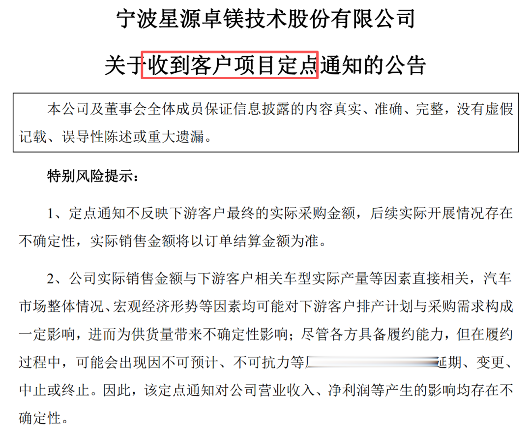 但星源卓镁也在公告中表示,公司实际销售金额与下游客户相关车型实际产量等因素直接相关,汽车市场整体情况、宏观经济形势等因素均可能对下游客户排产计划与采购需求构成一定影响,进而给公司的供货量带来不确定性。因此,该定点通知对公司营业收入、净利润等产生的影响均存在不确定性。