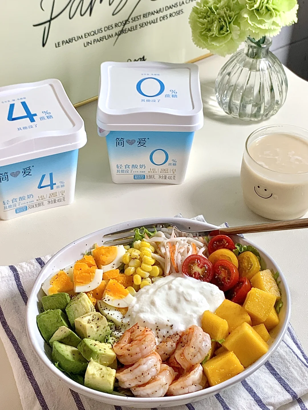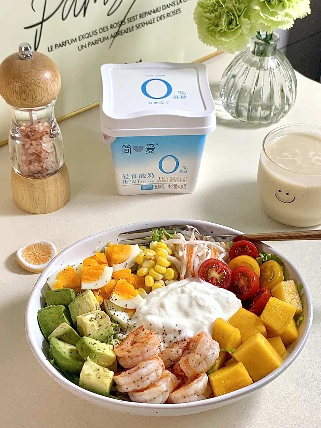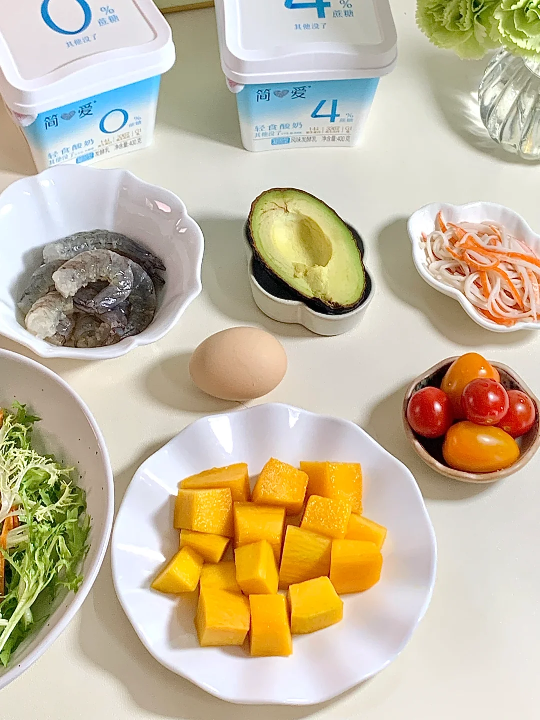 食材:简爱轻食酸奶、牛油果、芒果、虾仁、水果番茄、玉米、蟹柳、鸡蛋