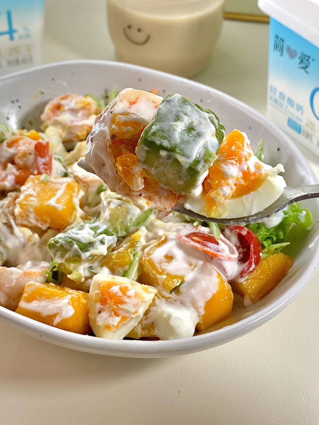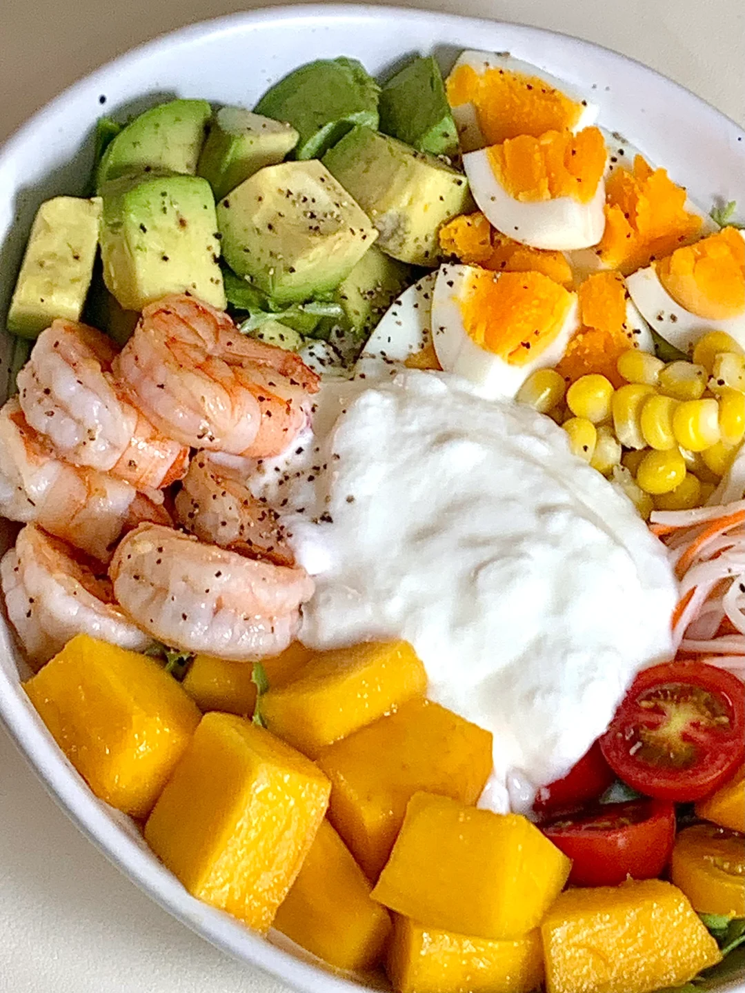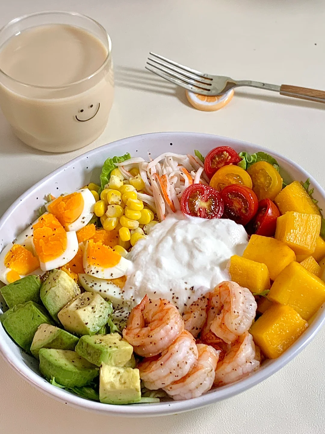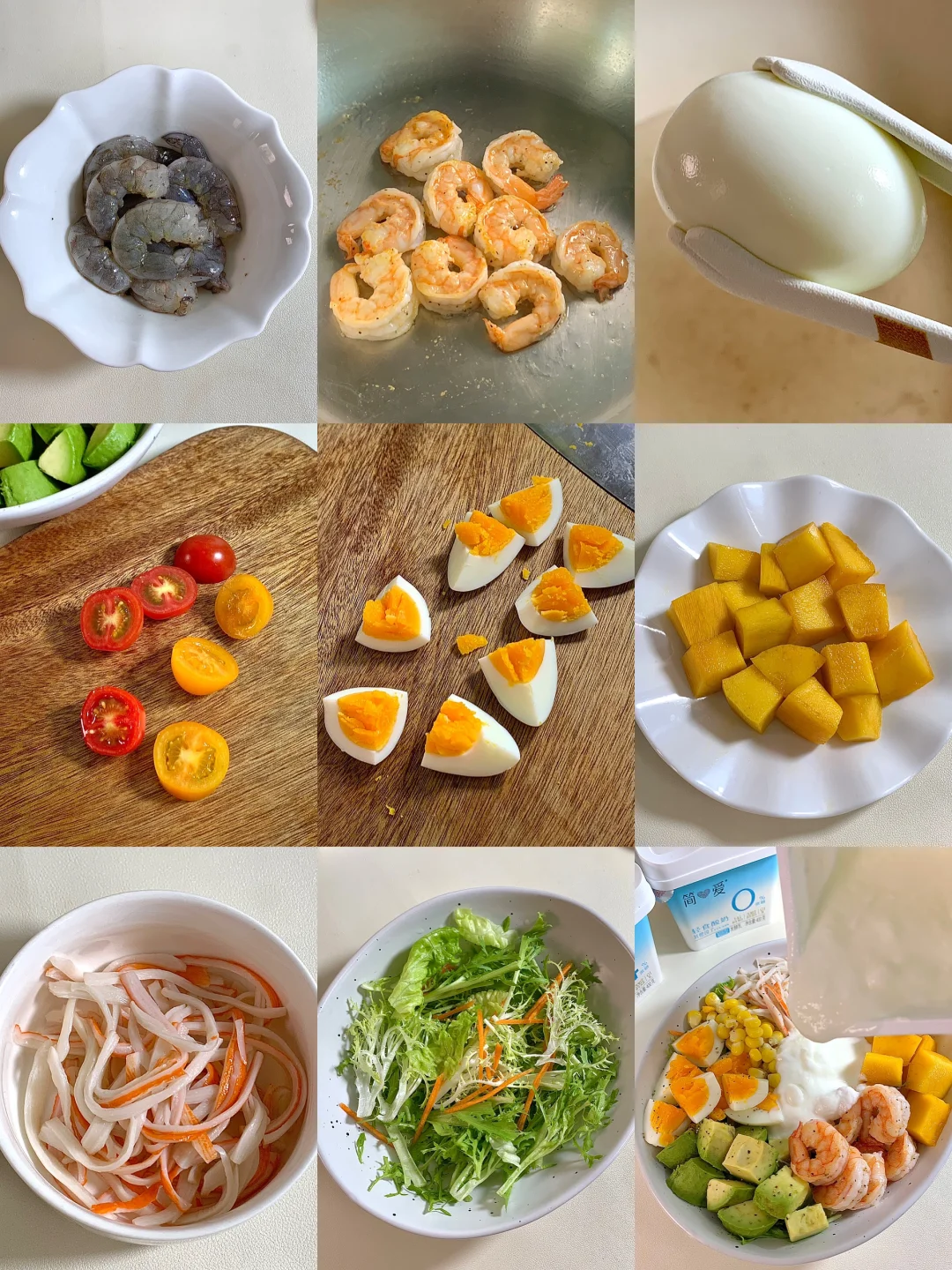 食材:简爱轻食酸奶、牛油果、芒果、虾仁、水果番茄、玉米、蟹柳、鸡蛋