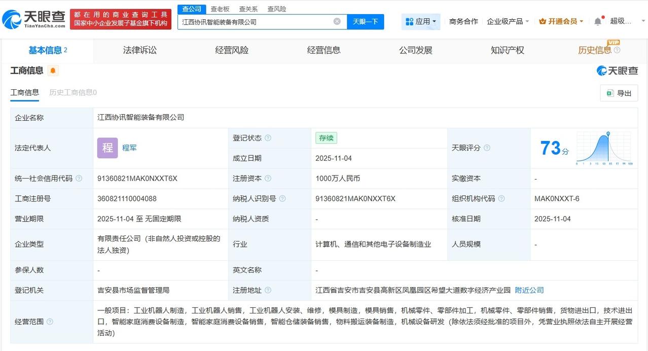 立讯精密在江西成立智能装备公司注册资本1000万 天眼查App显示,近日,江西协讯智能装备有限公司成立,法定代表人为程军,注册资本1000万人民币,经营范围包括工业机器人制造、工业机器人销售、智能家庭消费设备制造、智能家庭消费设备销售等。股权全景穿透图显示,该公司由立讯精密旗下协讯电子(吉安)有限公司全资持股。 天眼查信息: