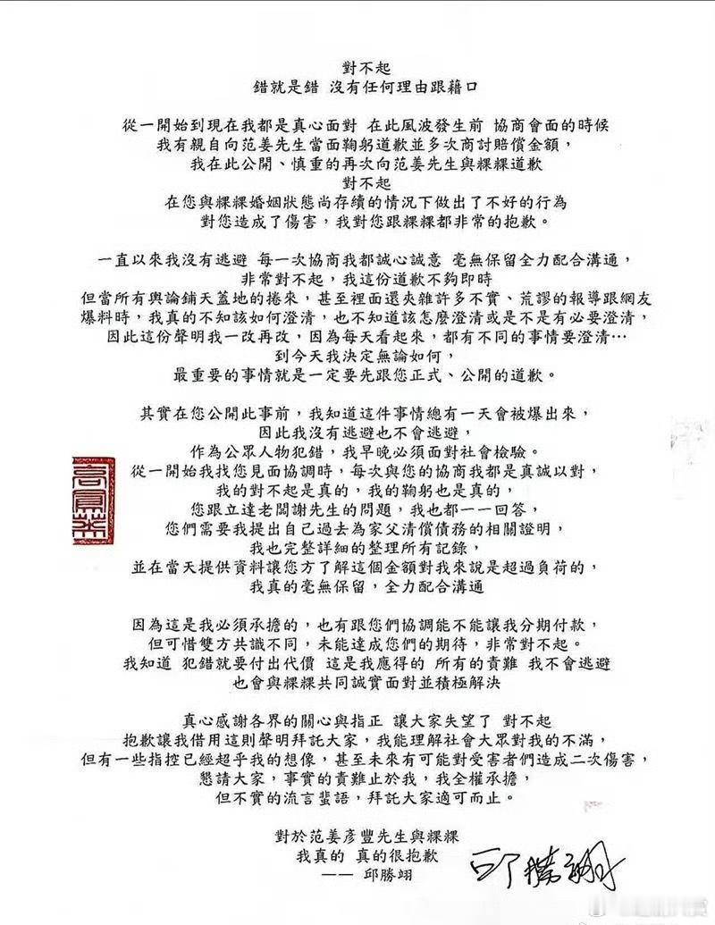 王子邱胜翊发声明向范姜彦丰粿粿道歉,承认插足范姜和粿粿婚姻,会承担赔偿不会逃避,会与粿粿共同诚实面对并积极解决问题。