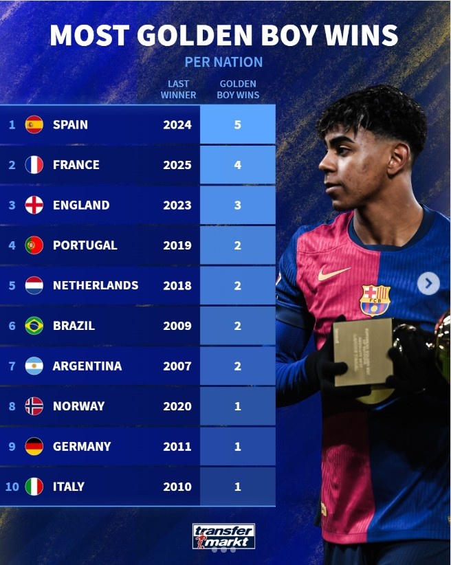直播吧11月5日讯巴黎圣日耳曼小将杜埃赢得了2025年金童奖,德转盘点了各国球员赢得金童奖次数,西班牙以5次居首。