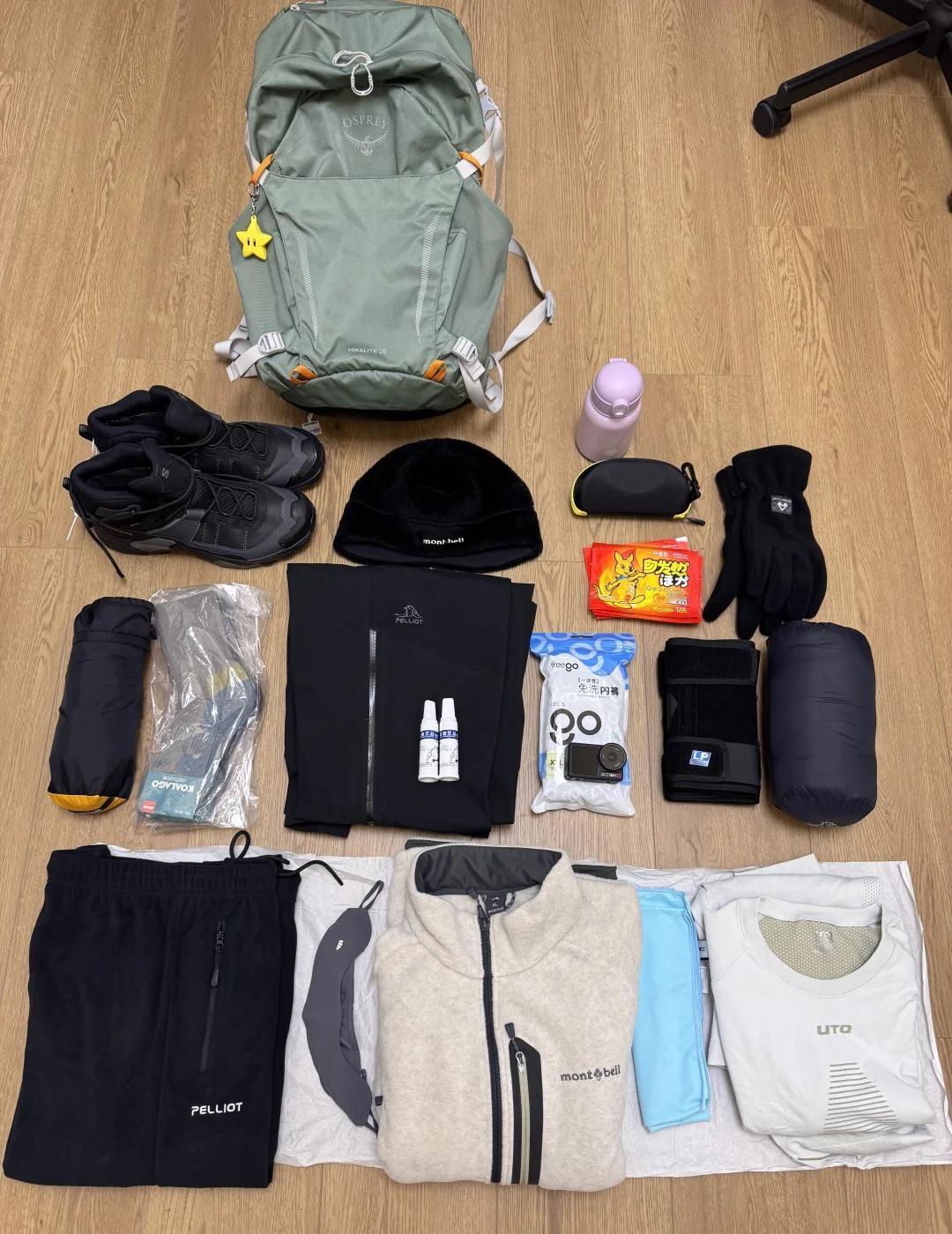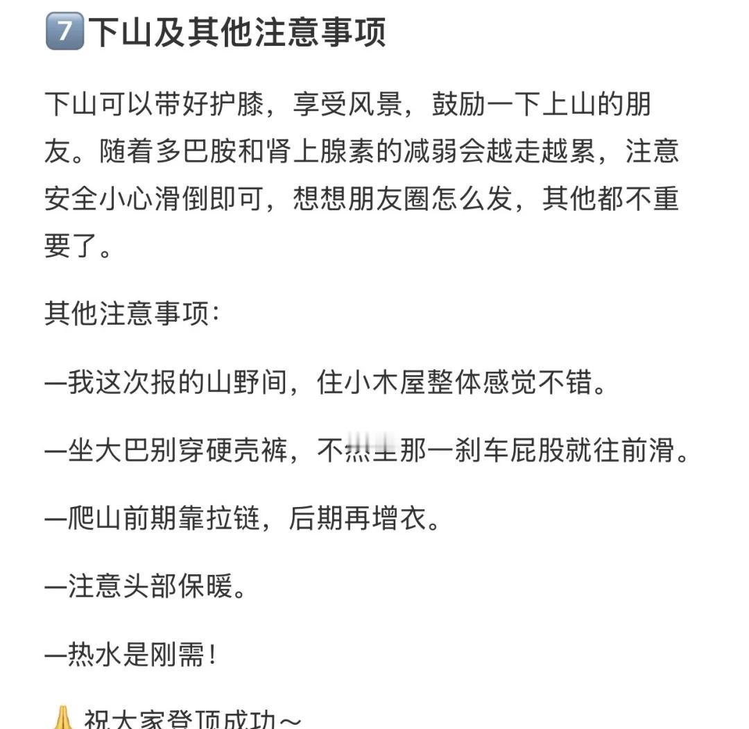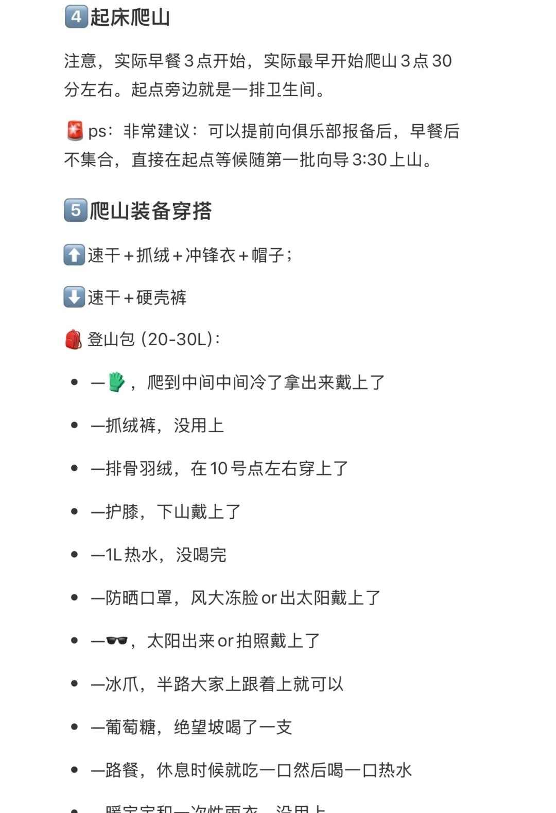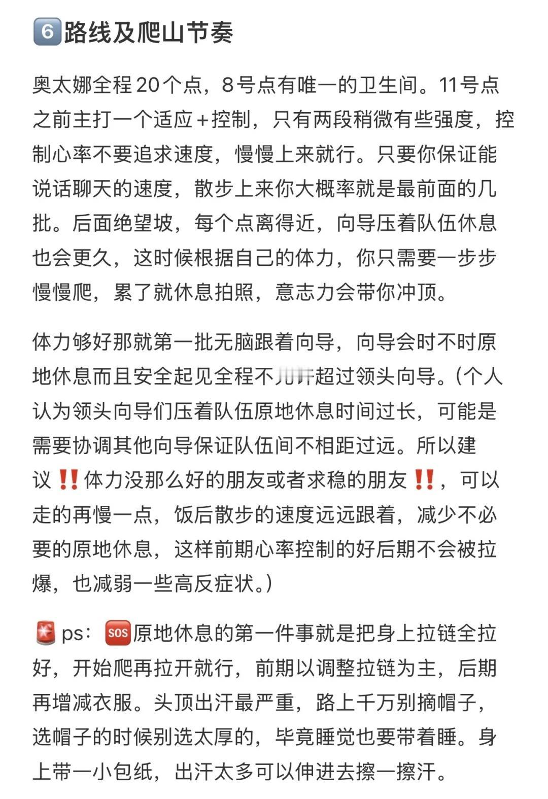 周末新手雪山奥太娜登顶成功版:包登顶攻略 接上篇,4.5小时前五登顶分享下整个过程。这篇写的详细一点包含很多注意事项,有计划的可以先收藏起来。 🍠字数超了详细内容见图片。 11月2号凌晨1k多人进攻奥太娜。睡眠不好+第一次爬雪山(小学生春游症犯了)导致高海拔失眠,戴着耳塞一晚上也没睡着。 0️⃣背景:平时健身无氧为主,出发前一个月加强了有氧和心肺,出发前一周暂停了力量训练。 1️⃣到大本营:放东西换衣服⚠️⚠️开电热毯。 🚨ps:大本营穿搭,⬆️速干+抓绒+排骨羽绒(有雨换成冲锋衣);⬇️速干+硬壳裤。帽子+羊毛袜+登山鞋。 2️⃣晚上准备:晚饭火锅,饭后开会(认真听讲),签风险告知书,领装备(冰爪+雪套+头灯+登山杖) 3️⃣睡觉,小木屋四人间。我一晚上没睡着但是也没有玩手机,闭着眼睛好好休息即可。 🚨ps:住大本营最好带一根usb充电线或小排插。 睡觉穿搭:帽子+羊毛袜+速干。 4️⃣起床爬山,实际早餐3点开始,实际最早开始爬山3点30分左右。起点旁边就是一排卫生间。 🚨ps:非常建议:可以提前向俱乐部报备后,早餐后不集合,直接在起点等候随第一批向导3:30上山。 5️⃣爬山穿搭装备:⬆️速干+抓绒+冲锋衣+帽子;⬇️速干+硬壳裤;🎒背包(20-30L):详细见图。 6️⃣路线及爬山节奏:奥太娜全程20个点,8号点卫生间。11号点之前主打一个适应+控制,只有两段稍微有些强度,控制心率不要追求速度,保证能唠嗑的速度,散步上来你大概率就是最前面的一批。后面绝望坡,每个点离得近,向导压着节奏休息也会更久,根据自己的体力一步步慢慢爬,累了就休息拍照,意志力会带你冲顶。 如果体力够好那就第一批跟着向导从头跟到尾。(个人认为领头向导们压着队伍原地休息时间过长。所以建议‼️体力没那么好的朋友或者求稳的朋友‼️,可以走的再慢一点,远远跟着,减少不必要的原地休息,这样前期心率控制的好后期不会被拉爆,也减弱一些高反症状。) 🚨ps:🆘原地休息第一件事:把身上拉链全拉好,开始爬再拉开。前期调整拉链,后期再增衣服。头顶特别出汗,路上千万别摘帽子,选帽子的时候别选太厚的。身上带一小包纸,出汗太多擦一下。 7️⃣下山和其他注意事项:注意安全小心滑倒,想想朋友圈怎么发。 最后,祝登顶成功!!!!!!新手雪山 奥太娜 入门级雪山
