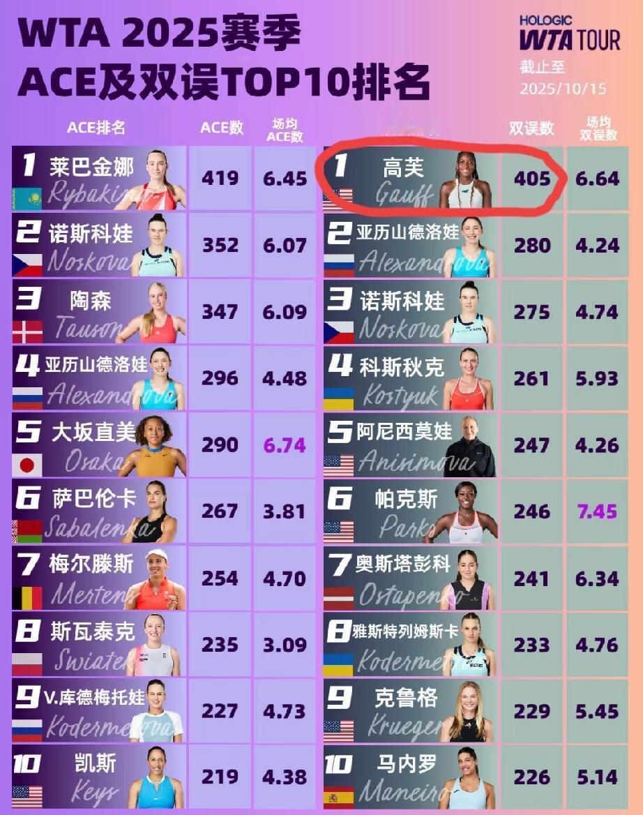 就在刚刚,高芙的双误数量来到了400个,这是官方给出的数据。 球迷不禁吐槽道:年终总冠军能不能卫冕先不知道,先卫冕个双误冠军吧! 关于高芙本赛季的双误数量,国内多个专业网球博主的数据跟今天wta给出的数据有所出入,在这些网球博主做出的表格里面,高芙早于10月15日就已经达到405个双误。不知道这到底是哪里出现了问题? 有没有专业的出来解释一下?
