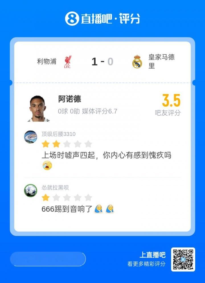 阿诺德的上场并未改变比赛的走势,最终皇马客场0-1落败。