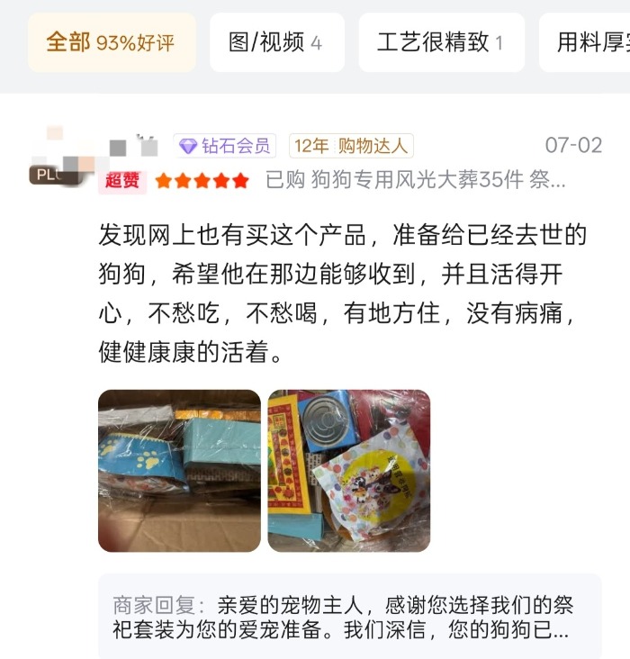 而点开另一家购物平台,大皖新闻记者看到,同样有各种宠物冥币纸品,价格在几元到一百多元不等,套装较多,多家店铺销量破千。而在评论区,还有不少消费者给了好评,并晒出购买的冥币。多名消费者留言均提到,是希望让爱宠在另一个世界也能丰衣足食,生活得更好。