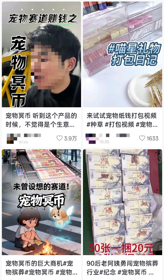 大皖新闻记者注意到,连日来,这一话题在多个社交平台流传开来,引发关注,一些视频中提到,宠物冥币越来越受欢迎,甚至随着文化输出,在海外也已流行。一些与宠物相关的行业账号更是将其称为“行业新风口”,认为是大势所趋,大有可为。