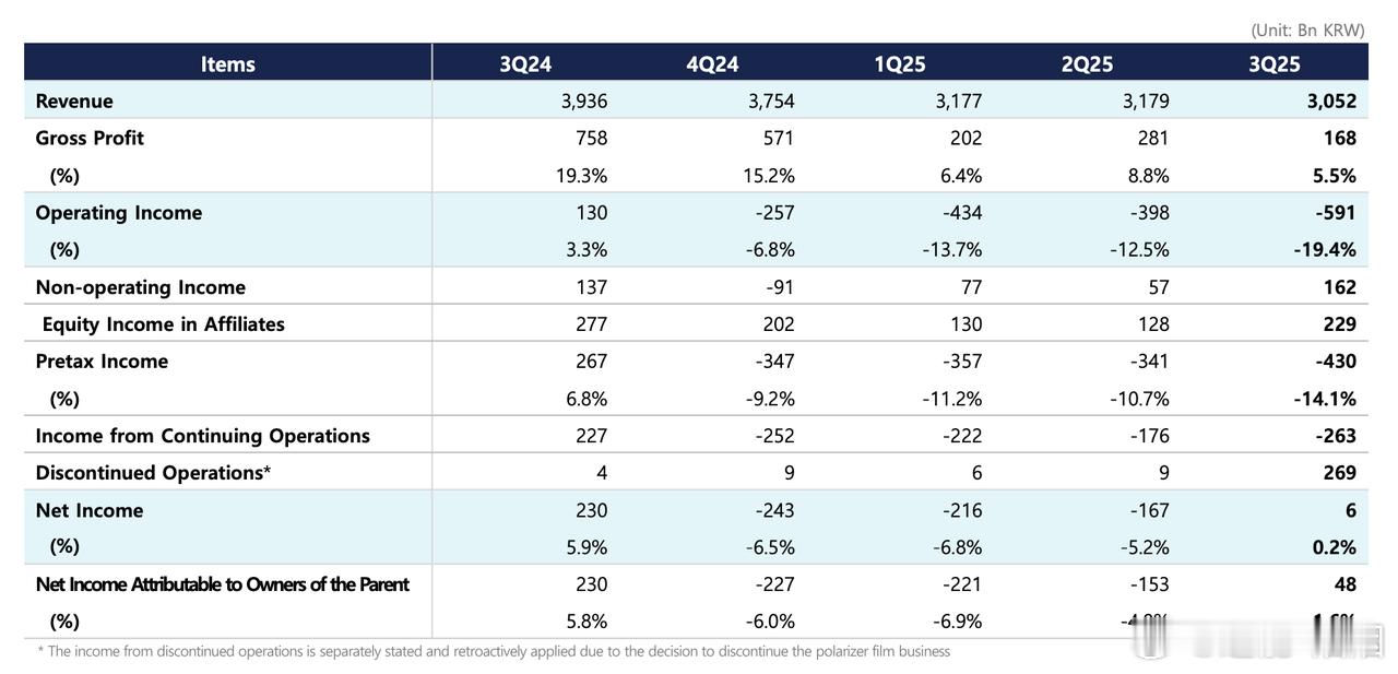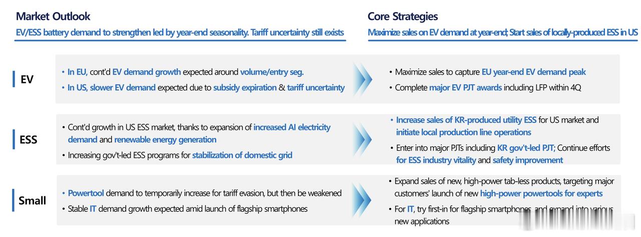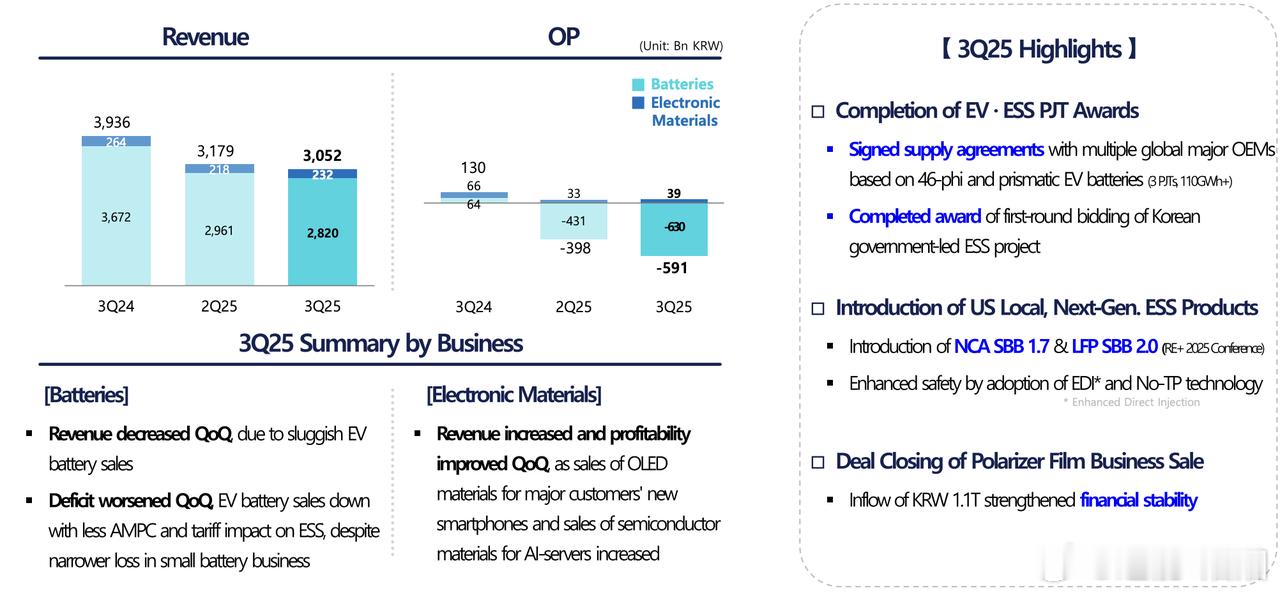 2025 年第三季度三星 SDI 日子不好过,营收同比下滑超两成,营业亏损扩大,创近年利润率新低。主要受电动汽车需求疲软和储能关税冲击,电池业务承压,不过电子材料业务因 AI 服务器和手机新机周期略有亮点。