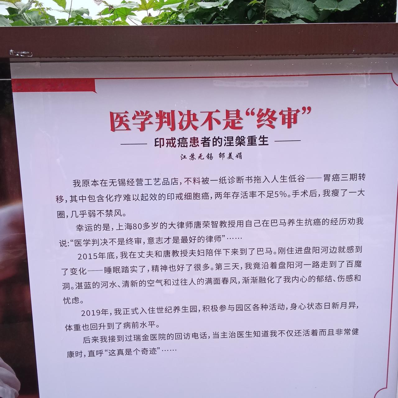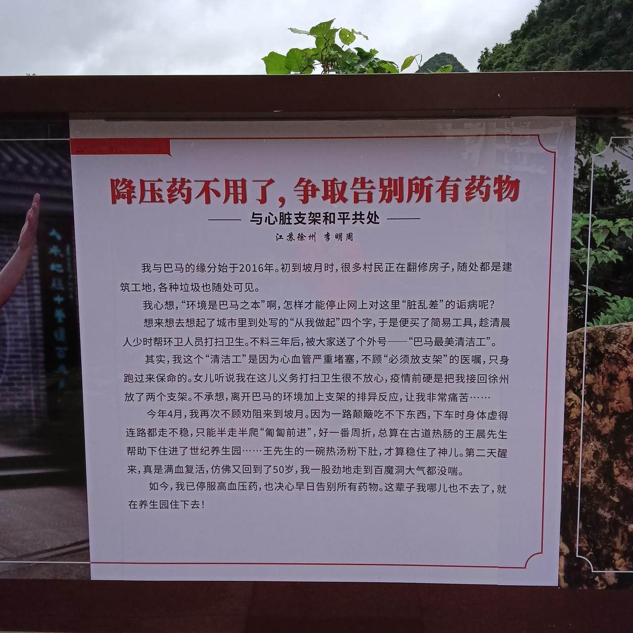 世纪养生园的康养成果墙 巴马养生获益者心生感恩 早上,由于要取快递避免排长长的队伍,我们很早来到了位于巴马县坡月街西两三百米的世纪养生园。 园内有一片长长的宣传版,上面记录着康养人的不同收益与感悟。 认真的读了两篇他真诚的感恩之心溢于言表那重获新生后的喜悦之情无法言说。 有一位中年女士换了肺部并转移头部的大病,OK当时被京城的最高级医院判了4个月“刑期”后便要离世。 她还是顽强的做了原位肿瘤的手术,再用靶向药和免疫治疗。 之后100天过去了。她可以坐着轮椅出院的时候就选择离开家乡离开京城来到了2000公里之外的巴马县。 这一住,4年过去了。女士不仅身体伤那个可恶的细胞消失了,而且还在这里找了一份帮助候鸟人康养的工作。 她说,她的生命是巴马给的。所以愿意付出时间、付出所有, 把一切都留在这里。 这样的故事还有很多,给大家拍下几张了解毕竟是别人的故事信不信由你。