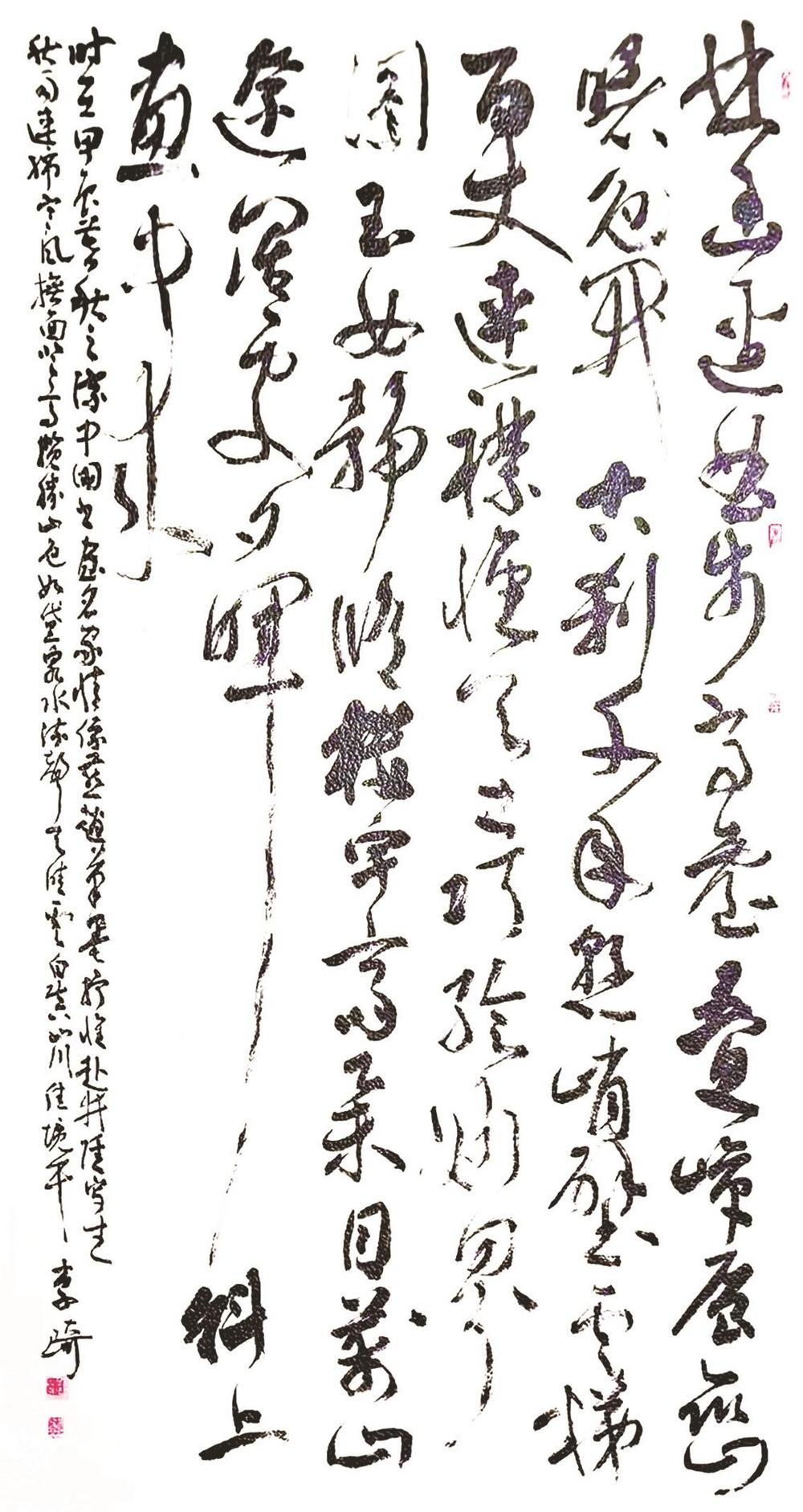 李琦现为中国书法家协会理事、市文联兼职副主席、市书法家协会主席,是一位诗书画兼修并卓有成就的艺术家。他长期致力于公益事业,曾多次向学校、博物馆等捐赠作品。此次捐赠的两幅作品,是去年秋天他赴井陉苍岩山采风创作的成果。他被苍岩山自然与人文景观深深打动,反复酝酿,几易其稿,最终完成国画《苍岩高秋图》及草书作品《秋上苍岩山》。两幅作品书画相融,气势恢宏,不仅承载中华优秀传统文化,更融入了对河北旅游文化的热爱与太行精神的弘扬,在省文学艺术中心展出后广受好评。