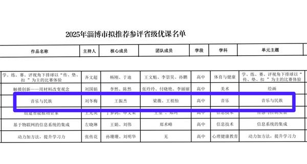 近日,淄博十七中音乐创课团队在2025年全市优课评选工作中斩获佳绩并晋级省级优课评选!由刘冬梅、王振杰、梁薇、王晓红四位老师组成的创课团队以《音乐与民族》课程体系惊艳亮相,凭借深厚的专业素养、创新的教学设计以及覆盖“民歌”“曲艺”“世界音乐”三大板块的优质课例,从众多参赛团队中脱颖而出,被推荐参评省级优课。