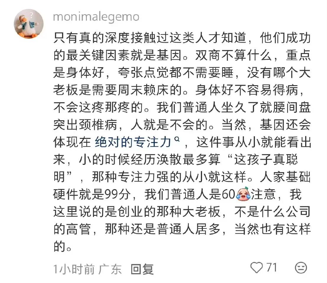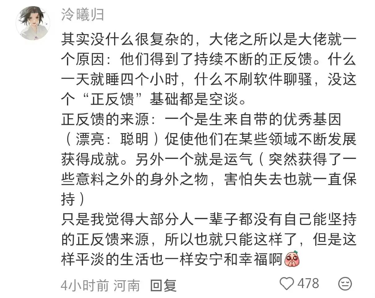 身体好,专注,正反馈,就是成功的三大法宝。很有道理,很有道理。但凡咱们一事无成,
