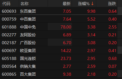 上证报中国证券网讯11月5日早盘,零售概念股拉升,截至9时54分,东百集团涨停,中百集团涨超5%,中国中免、友阿股份、广百股份涨超3%,国光连锁、欧亚集团等跟涨。