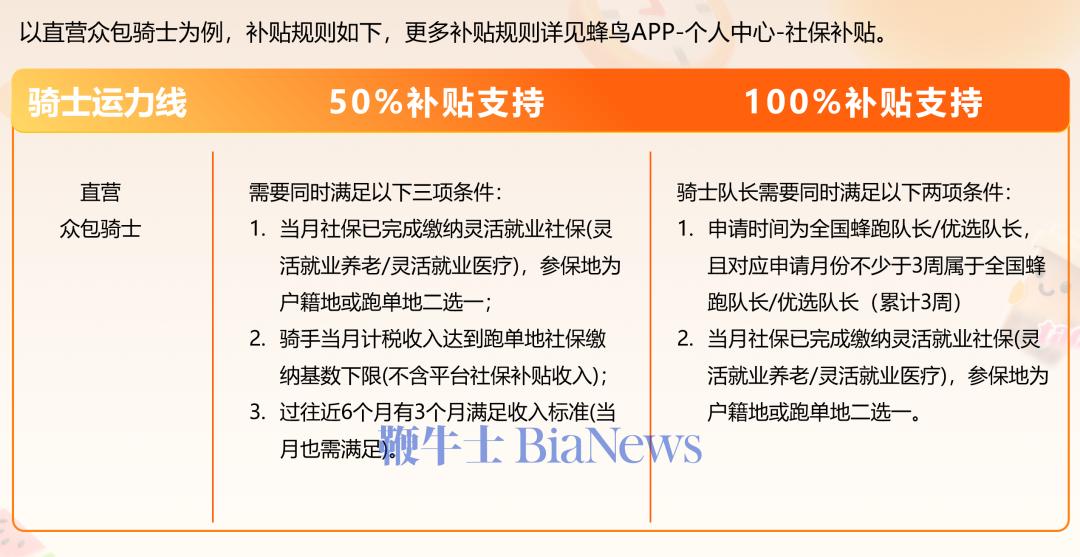 官方对于全国稳定跑单且有意愿缴纳养老、医疗保险的骑士,将补贴至少50%保险费用,对骑士队长、荣誉骑士则将全额补贴。
