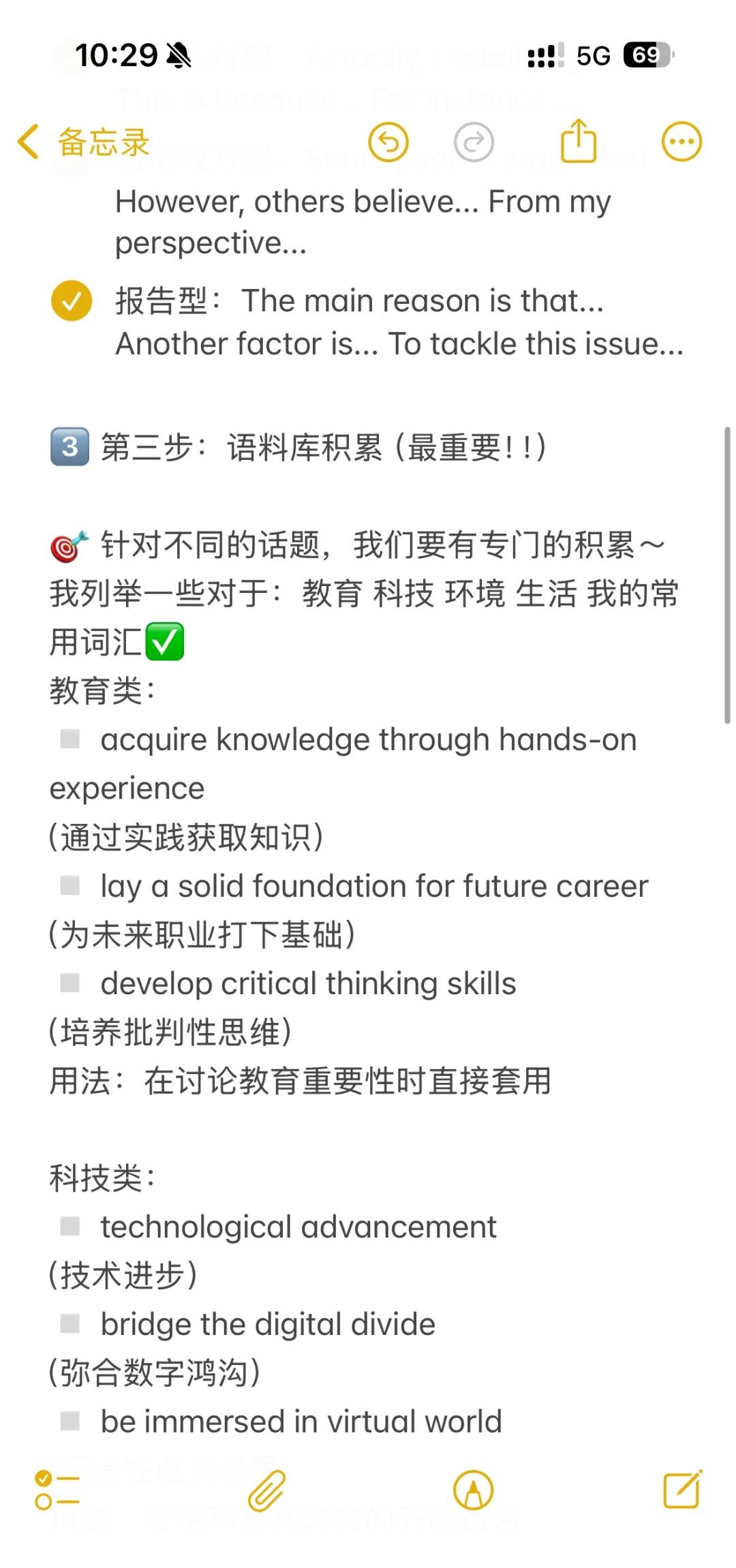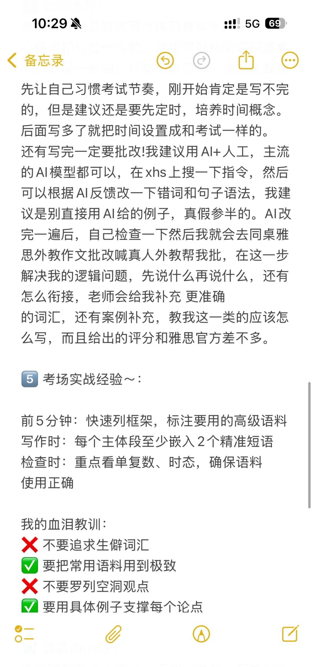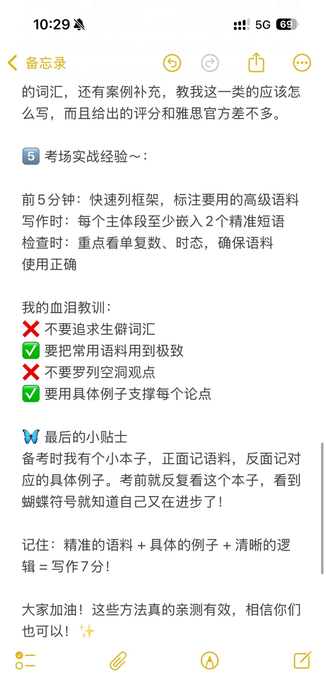 首考写作7分|唠唠我的备考小本本 📒 之前发经验贴,好多宝子说想看写作细节,这不就来了嘛!首考能冲到7分,跟大家唠唠我都是咋准备的[赞][赞] 其实说白了,就是要找到正确的方向[害羞]我最开始也是闷头写,后来发现不行,得先搞清楚一篇好作文到底长啥样。我就去小电视上看那些大神拆解框架,学他们怎么立观点、怎么摆例子。比如让你讨论一个现象,你不能光说“我同意”,得能讲出“因为啥”,再举个特别具体的例子,就像聊家常一样,把道理说透。 框架有了,词汇也很重要我就专门弄了个小本本,按教育、科技、环境这些常考话题,分门别类地记表达。不是什么高深词汇,就是像 acquire knowledge through hands-on experience(通过实践学知识)、bridge the digital divide(弥合数字差距)这种又准又地道的短语。记下来不是就完事了,得逼自己在每次练习里用上几个,用熟了才是自己的。 对了,练习和批改特别重要!我都是掐着表写,写完先让AI帮我看一眼语法和用词,然后再找同桌雅思外教作文批改帮我深挖逻辑问题,比如段落为啥接得不顺,例子为啥没说服力。这么折腾几篇下来,心里就越来越有数了 总之呢,感觉写作就是框架、语料和练习三件套,把握好节奏就行。上面就是我的一些小经验,希望能帮到你们呀!如果还有什么想细问的,评论区见就好![飞吻] 雅思写作 雅思大作文 同桌雅思 同桌雅思作文急救屠雅成功 考雅经历 屠雅攻略