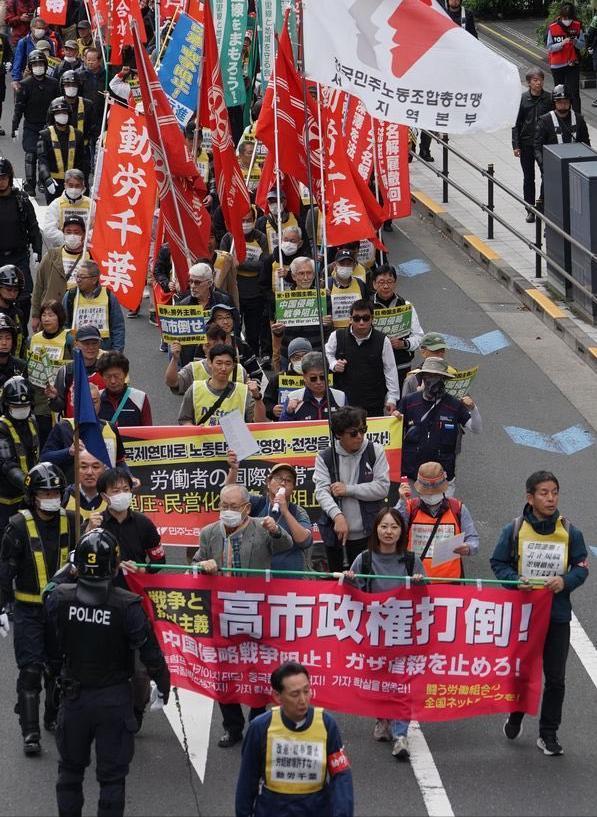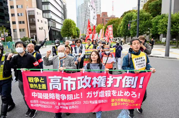 近日日本东京街头一幕:高喊“打倒高市早苗”的游行队伍。 据媒体报道,游行队伍有2000多人,由几个日本左派团体共同组织。一名团体领袖在集会上说:“作为工人阶级的我们,面对帝国主义这一敌人,今天从全世界汇聚到了这里。”他呼吁:“打倒高市早苗和特朗普!阻止美日对中国的侵略战争!”并表示“要战斗到革命胜利的那一天”。在大批警察的戒备中,参加者手举写有日本各地工会名称的旗帜和“打倒高市”“阻止侵略中国”等标语,高喊着“粉碎大规模军备扩张预算!”“反对侵略中国的战争!”等口号进行游行。期间,有日本右翼试图破坏游行,他们隔着街道用大喇叭喊:说美日在侵略中国,那告诉我们现在哪里在打仗?现场一度陷入混乱,在警方的阻止下双方才没有进一步冲突。