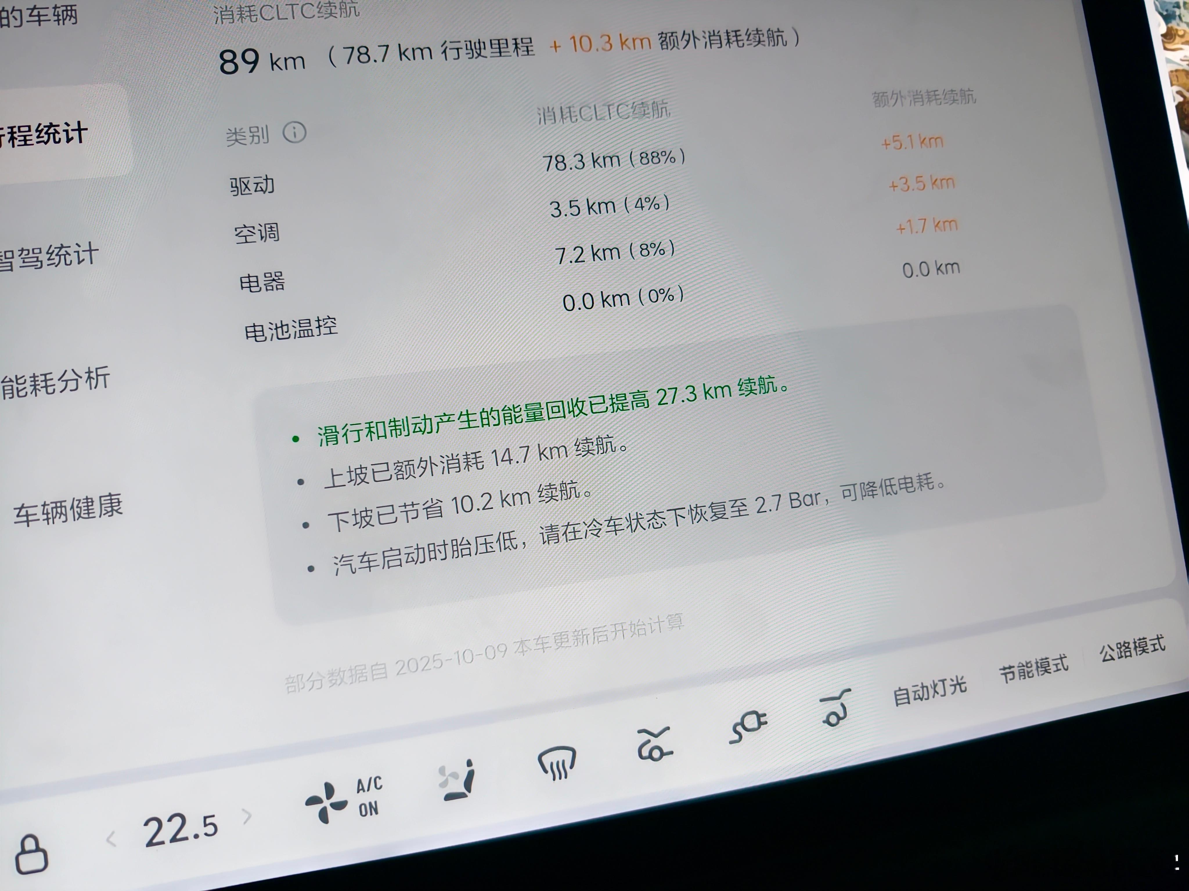 电器占比 7.2%,这部分不知道是指什么(经网友提醒,这部分包括了AD 电耗)。因为我一路只连着手机蓝牙听播客,也没有开座椅按摩,但两个大屏是亮着的。