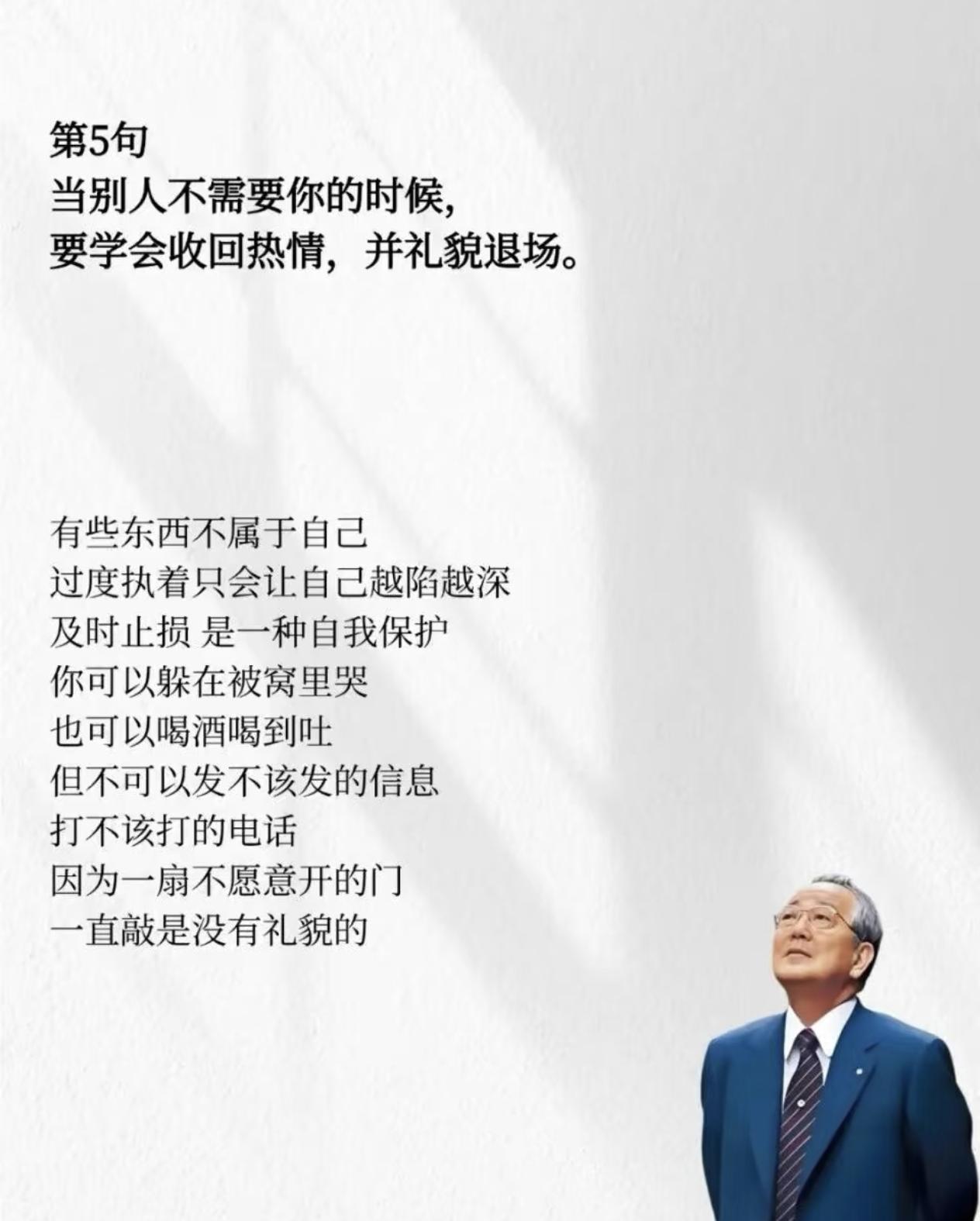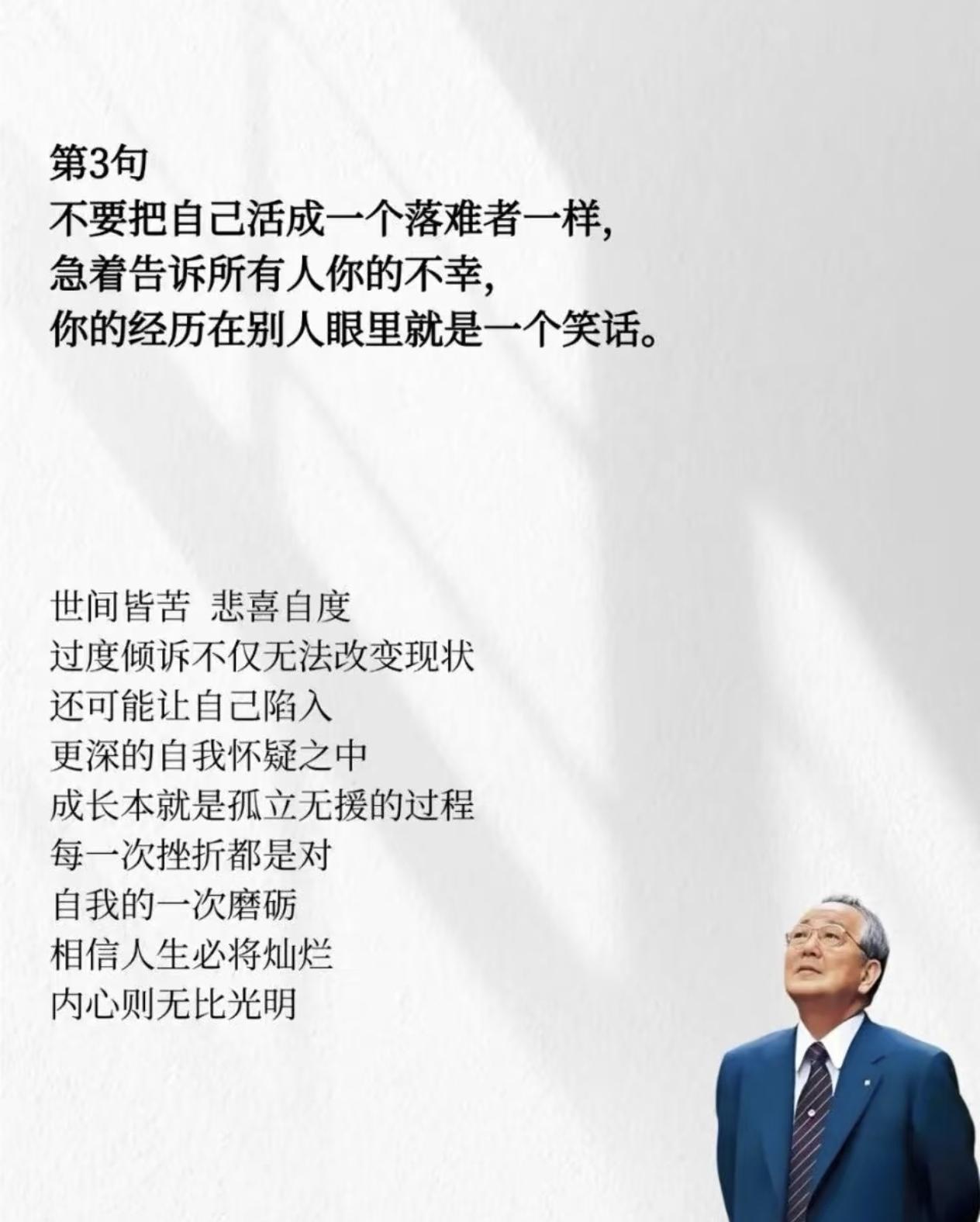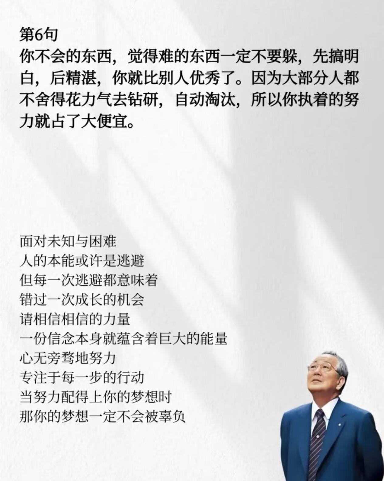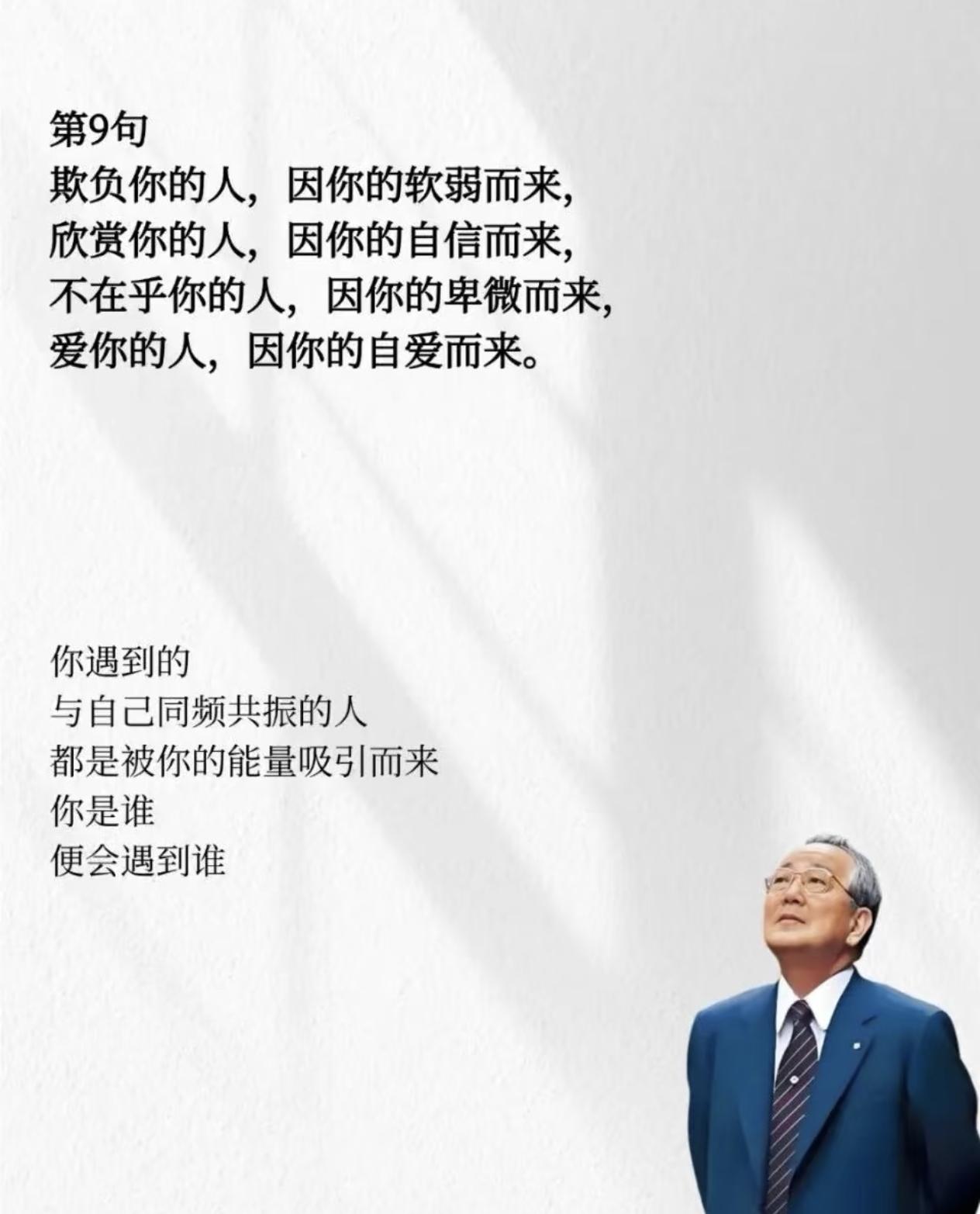 天不限人而人自限,稻盛和夫说:你生来就无所有,何惧从头再来?轻飘飘的一句话,后面需要付出极大的勇气和行动。 无论处于什么境遇,好也罢,坏也罢,生活如同长江大河,不会因为自己的情绪而发生改变,现实多么残酷,正是因为如此,限制自己行为的往往是自己,生活的位移突然不再适应了,其实是自己给自己划定了界限,限制了自己的行动。 羡慕那些能够在大风大浪中笑谈风声的人,不知道他们当时是怎么自渡的,或许他们承受的比自己想象的多。 有一种效应叫做“总观效应”,说的是人类踏上了太空,从太空的角度看地球,发现一个蓝色的球体漂浮在虚空,有一种随时会掉进万丈深潭的感觉,此时国家的界限,同僚的倾轧,世界的纷扰,在这一刻都不值得一提。 整理稻盛和夫的10句话,或许对于生活的方式,会有更深刻的理解。