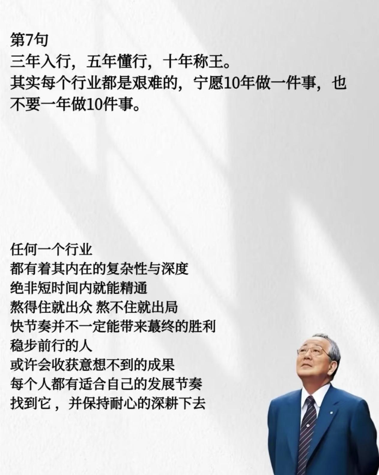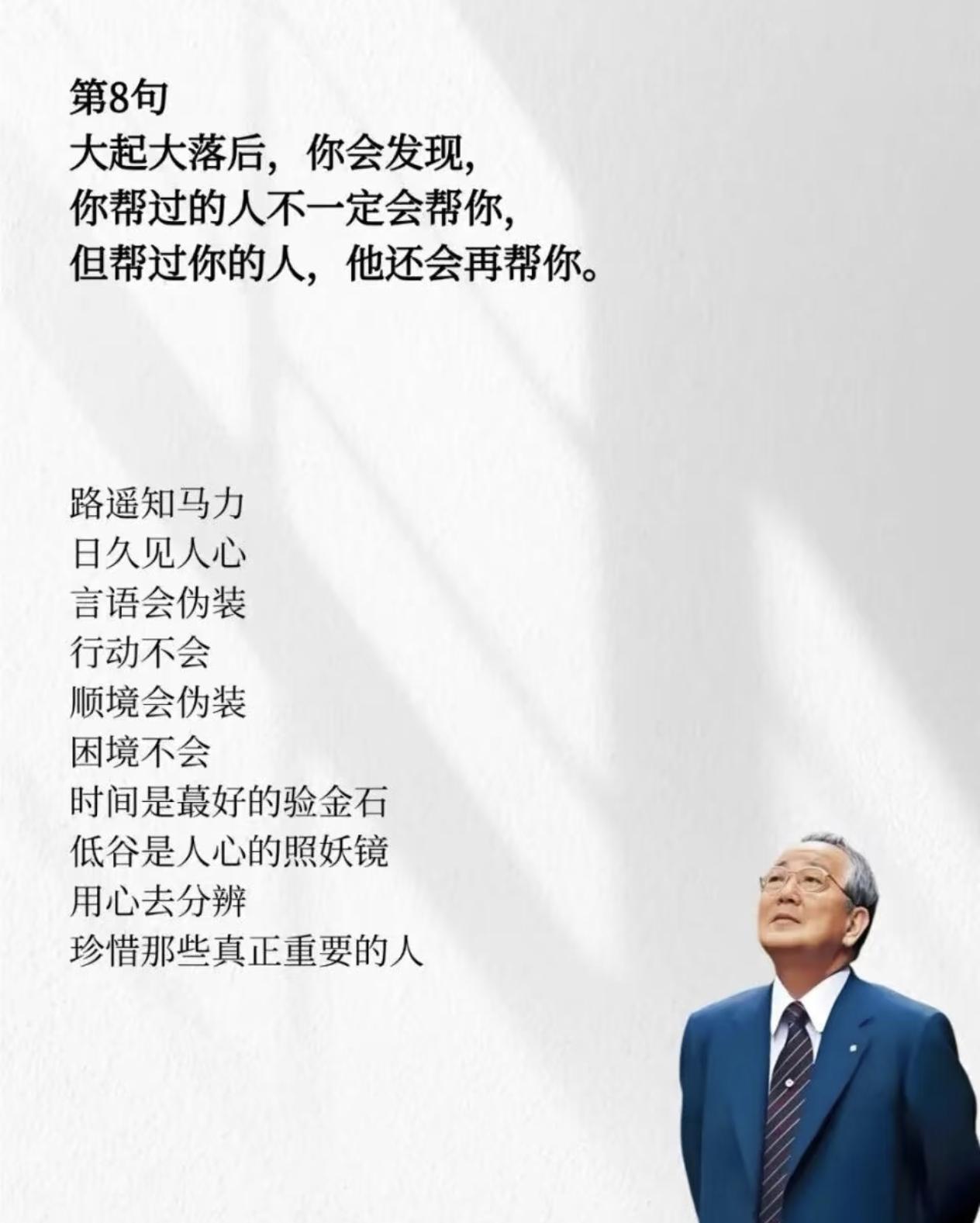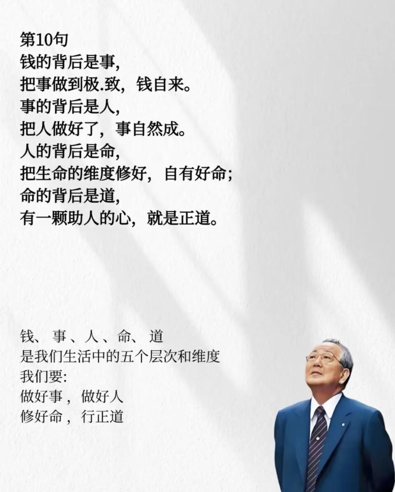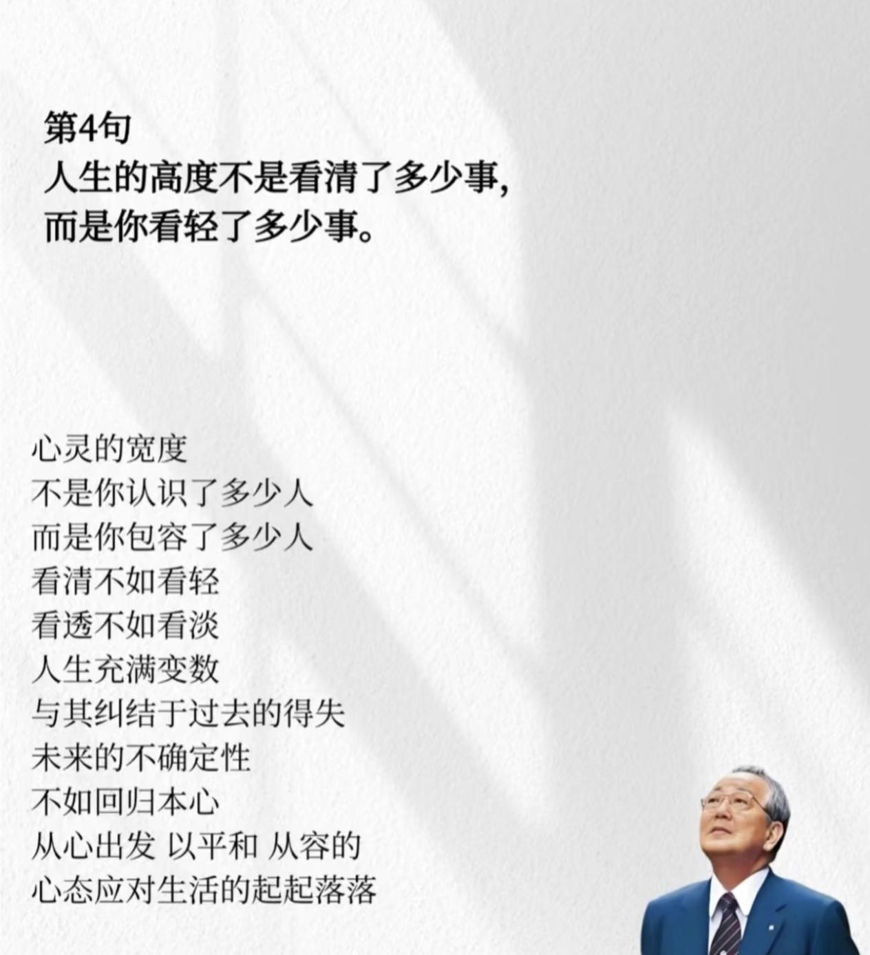天不限人而人自限,稻盛和夫说:你生来就无所有,何惧从头再来?轻飘飘的一句话,后面需要付出极大的勇气和行动。 无论处于什么境遇,好也罢,坏也罢,生活如同长江大河,不会因为自己的情绪而发生改变,现实多么残酷,正是因为如此,限制自己行为的往往是自己,生活的位移突然不再适应了,其实是自己给自己划定了界限,限制了自己的行动。 羡慕那些能够在大风大浪中笑谈风声的人,不知道他们当时是怎么自渡的,或许他们承受的比自己想象的多。 有一种效应叫做“总观效应”,说的是人类踏上了太空,从太空的角度看地球,发现一个蓝色的球体漂浮在虚空,有一种随时会掉进万丈深潭的感觉,此时国家的界限,同僚的倾轧,世界的纷扰,在这一刻都不值得一提。 整理稻盛和夫的10句话,或许对于生活的方式,会有更深刻的理解。