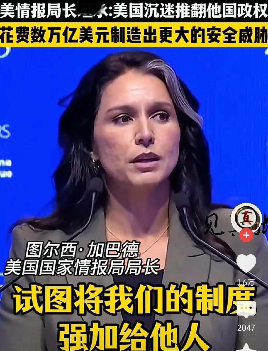 这位美国国家情报局局长图尔西·加巴德“良心发现”!她说:几十年来,美国的外交政策一直专注于他国的政权更迭和他国建设,试图将我们的制度强加给他人,并干预我们不理解的冲突。结果导致花费数万亿、无数人丧生,制造出更大的安全威胁。 不知道她是真的“良心发现”,还是心疼那么多美元打了水漂,或者说是担忧美国的未来。不过从其言论不难看出,她的这些话还算是肺腑之言。人尽皆知的伊拉克战争、利比亚战争就是最好的证明。当然了,曾经的南联盟更是美国的“大手笔”。 不过话又说回来,如今的美国怎么看也是有些力不从心了,一个胡塞武装都让美国费劲巴拉的搞不定,还谈什么政权更迭。再看看搞个演习就摔飞机的奇葩表现,老美也只能放出这种风声收敛自己的气息了!