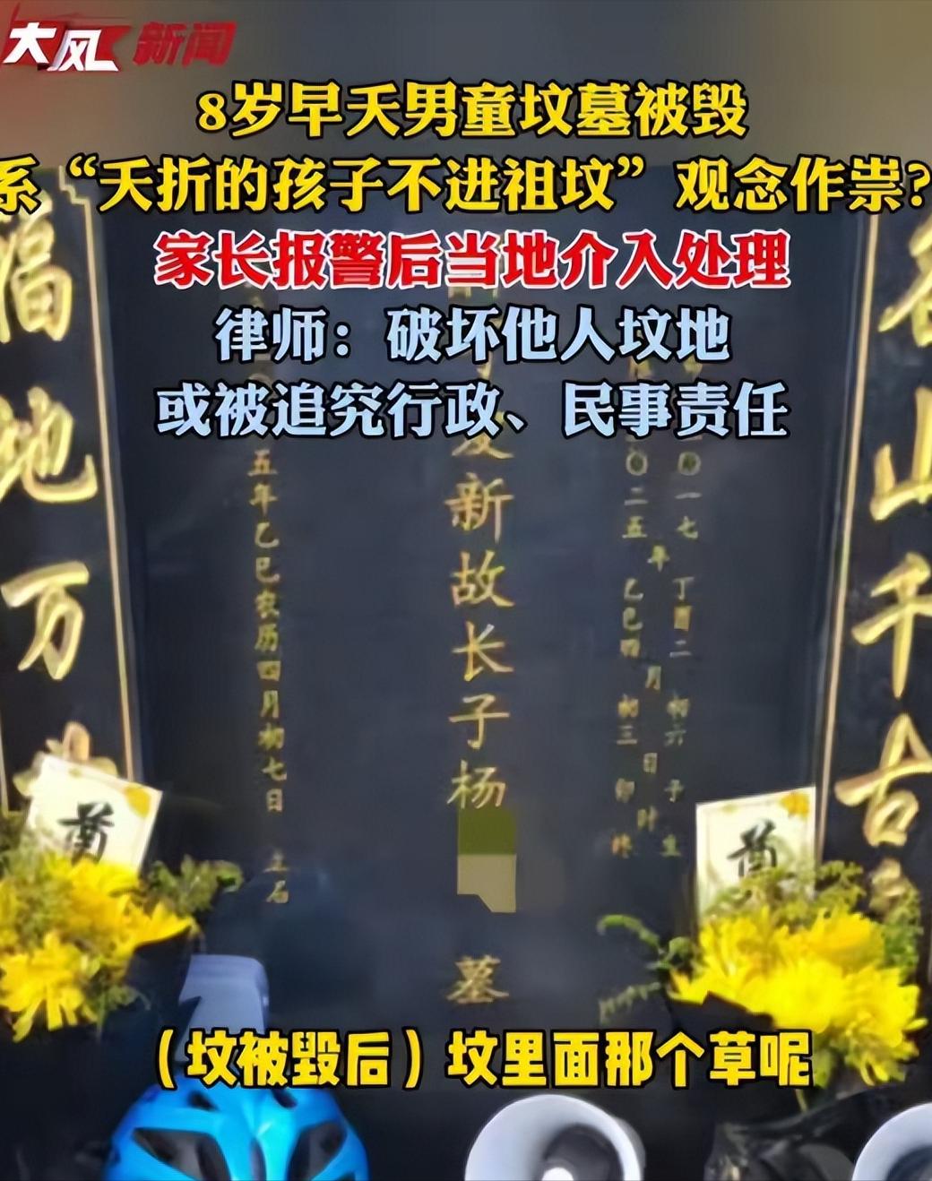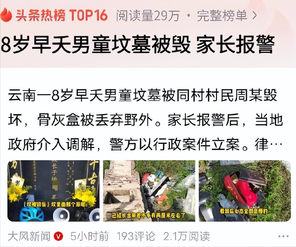 云南大理,男子的8岁儿子意外摔倒死亡,他强忍悲痛,给孩子在国有林地修了坟墓,安葬4个月后,他发现坟墓被毁,儿子的骨灰盒被丢在野地,石板压在儿子的骨灰袋上,男子悲愤万分,想起同村一村民曾警告他迁坟,因为离其祖坟太近了,男子认为林地不是该村民家的,就没同意,没想到遭此横祸。因此,男子报了警,这下闹大了。   “不迁坟,我就把你儿子的坟推平!”杨先生(化姓)没想到,这句充满恶意的威胁,竟然真的变成了一场令人发指的暴行。   小杨是个不幸的孩子,从半岁起就被确诊小脑萎缩和癫痫,3岁就成了肢体一级残疾。直到今年4月底,一次意外摔倒夺走了他年仅8岁的生命。   白发人送黑发人的杨先生强忍悲痛,特意找村干部给孩子寻了一处安葬的地方。可偏偏这块地碍了同村周家人的眼。   原来,村干部所说的墓地,是距离村子三公里外的一片国有林地。按理说是公用的,可周家人早就在此立了几座墓碑,想当然的把国有林地变成了自家祖坟。   如此一来,小杨的坟立在这里,周家人当然不同意,强硬要求杨先生迁坟。他们自认为先祖葬于此,周边区域就天然归他们家族使用。   杨先生曾表示:“只要他们能证明林地是他们私人的,我就迁。”然而周家即使拿不出任何权属证明,依然底气十足:“你们杨家明明有自己的坟地,为什么把孩子埋在别处?”   对于周家人的这一质问,杨先生无奈道:“夭折的孩子不进祖坟是当地风俗,总不能让孩子曝尸荒野吧!”   这种将封建习俗凌驾于国家法律之上的思维,最终酿成了恶果。周某等人公然践踏村干部“不能毁坟”的警告,悍然破坏了小杨的坟墓。这种暴行,不仅是对一个悲伤家庭的致命一击,更是对现代法治社会的公然挑衅。   整起事件暴露出的问题触目惊心。封建宗族观念在某些地区依然顽固不化。为了所谓的“家族风水”“传统习俗”,可以无视国家法律,肆意侵犯他人合法权益。这种思维如果得不到彻底清算,类似悲剧还会不断重演。   最让人痛心的是,对于一个刚刚失去了孩子的家庭来说,本该是得到邻里乡亲同情关怀的时候,却遭到了最残忍的对待。这种“恃强凌弱”的行为,无疑是对社会道德底线的彻底践踏。   这起悲剧应该引起全社会的反思,任何封建陋习都不能成为违法的挡箭牌。同时,执法机关应当严格依法办事,对明显构成犯罪的毁坏骨灰行为,必须依法追究刑事责任,维护法律的严肃性。对此你有什么看法?欢迎在评论区留言讨论。 祖坟 封建陋习   信息来源: 红星新闻2025-10-29|8岁男童意外去世,4月后家人发现坟墓遭破坏,当地有“夭折的孩子不进祖坟”观念,家长报警后官方已介入 文|墨海 编辑|史叔
