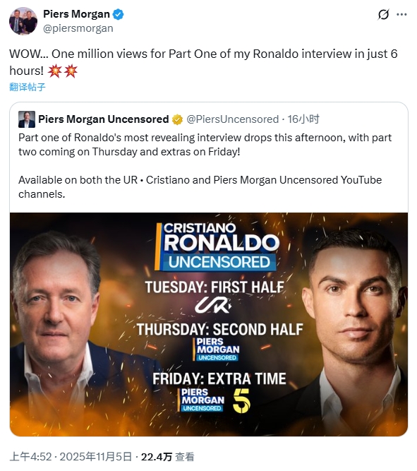 今晨摩根发文:“哇……我的C罗采访视频第一部分,短短6小时就突破了100万点击量!”