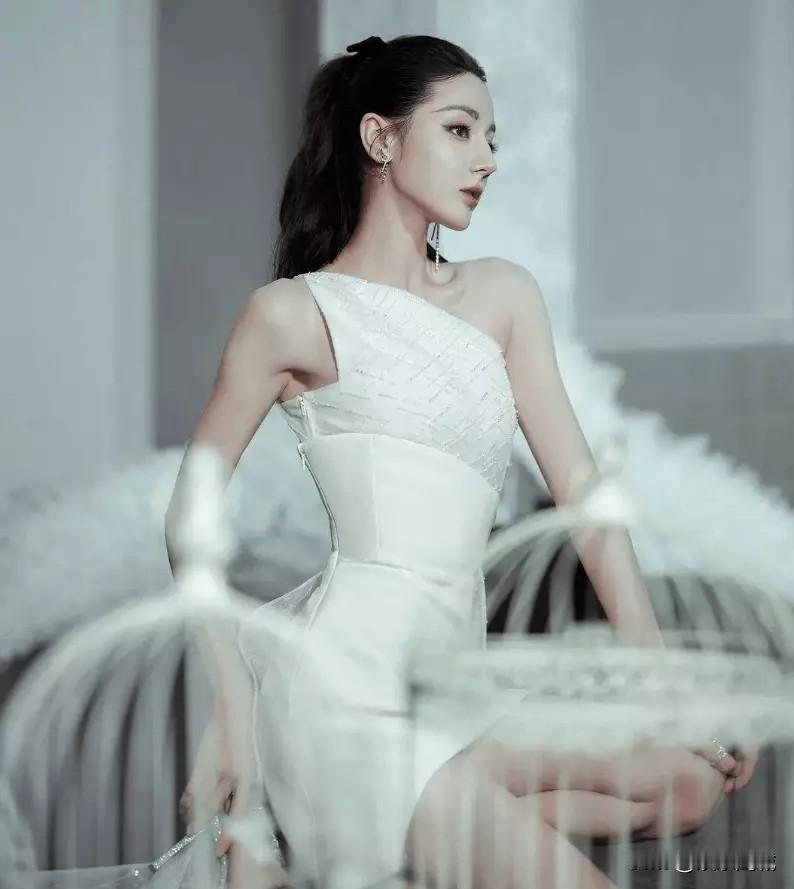 迪丽热巴一袭白裙斜肩设计,宛如仙子下凡。单肩巧露香肩,另一侧布料轻绕腰间,勾勒出纤腰楚楚,三围黄金比例尽显。短裙下,修长美腿若隐若现,令人移不开眼。她慵懒倚坐沙发,手捧书卷轻触唇边,眸光低垂,似有千般思绪。妆容清透如晨露,眉眼含情,唇角微扬,恰似“淡妆浓抹总相宜”。高马尾配几缕碎发,柔美中透着利落。白色羽饰与鸟笼相映,梦幻氛围油然而生,这般优雅性感,怎不叫人怦然心动? 迪丽热巴