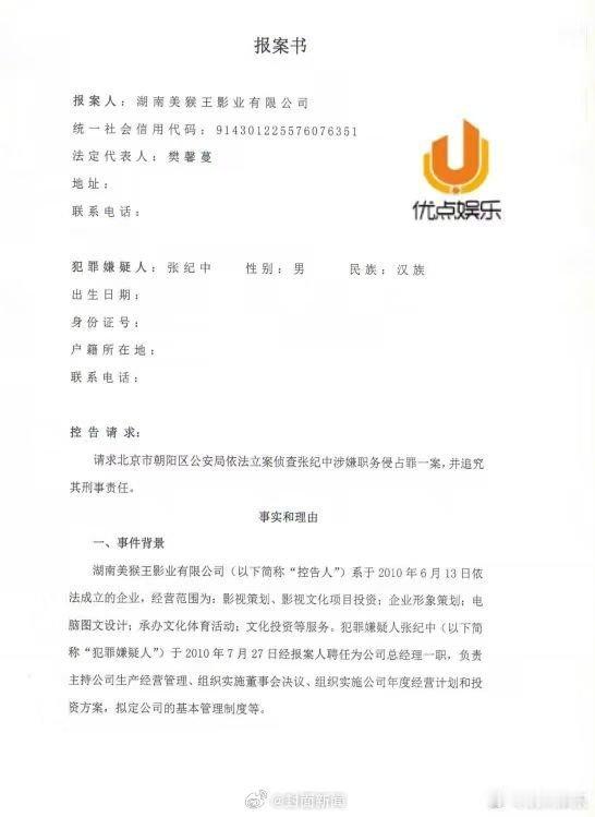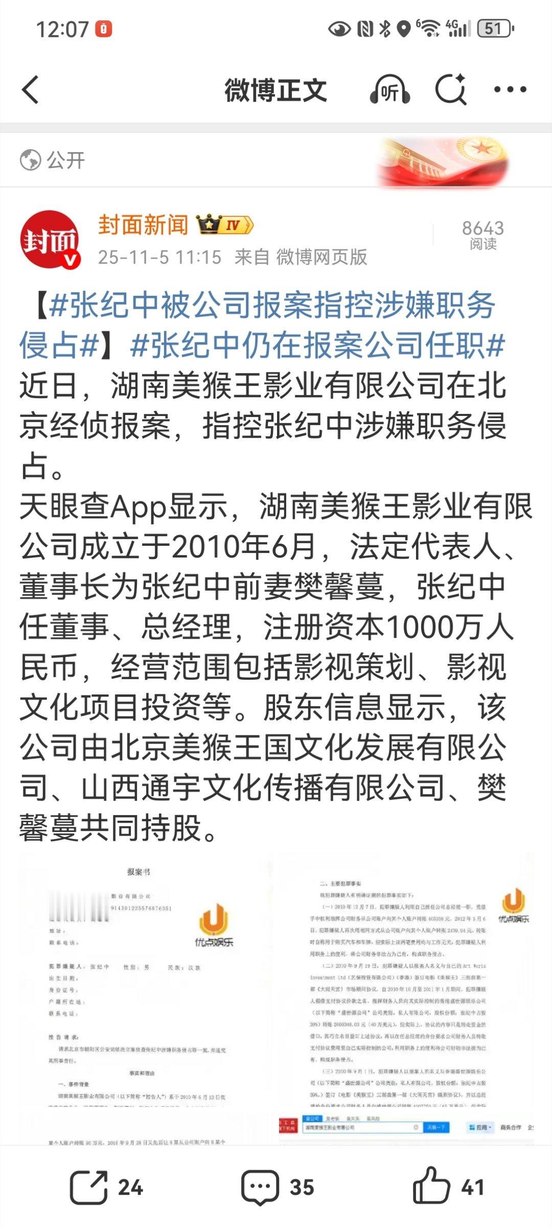 【张纪中被公司报案指控涉嫌职务侵占】张纪中仍在报案公司任职张纪中被其担任总经理的湖南美猴王影业公司报案指控涉嫌职务侵占。该公司由其前妻樊馨蔓任法定代表人,二人此前曾因隐私权纠纷对簿公堂,法院判决张纪中道歉并赔偿。