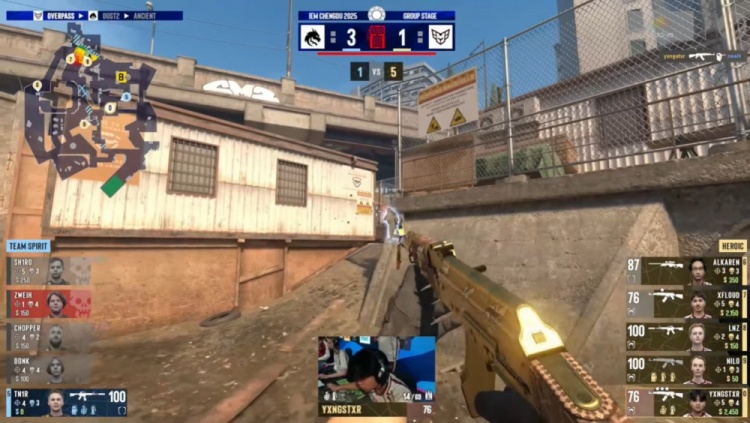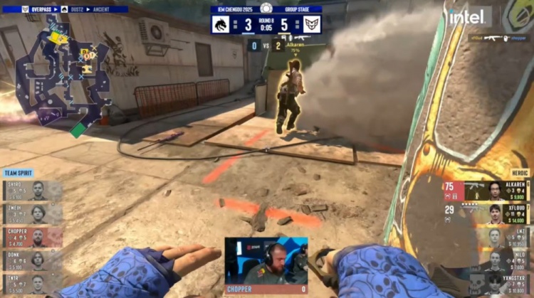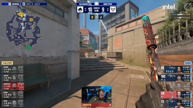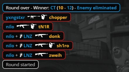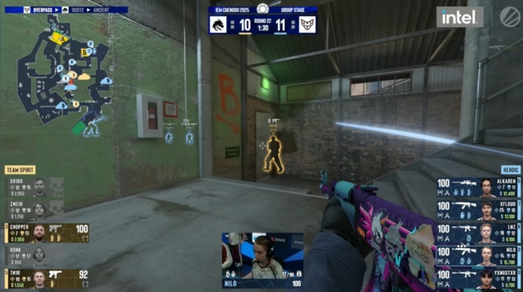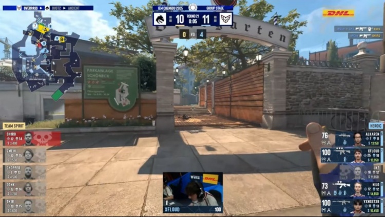 X队上半场先攻,手枪局X队全员来B,donk配合chopper闪光弹双杀,残局ALKAREN先杀tN1R后被chopper带走,绿龙1-0X队。