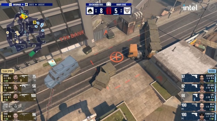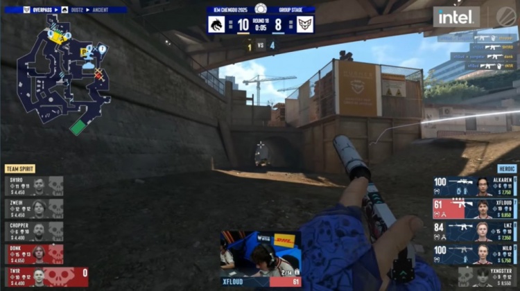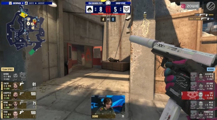 第8局Spirit全员存钱,X队继续提速冲B,donk混烟带走LNZ,zweih首杀nilo,xfloud先杀tN1R再杀donk后捡起大狙再杀zweih最后换AK融化chopper,完成五杀,绿龙3-5X队。