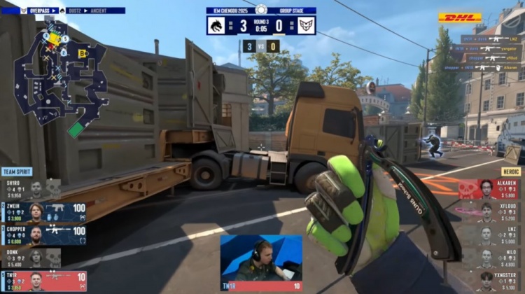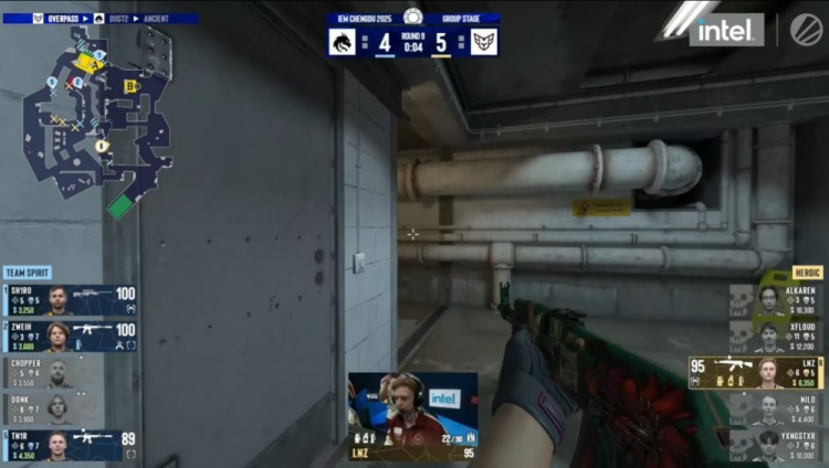 第9局Spirit暂停回来,donk前顶厕所先杀xfloud,chopper跟上补掉yxngstxr后被换,donk再杀nilo,sh1ro大狙架A大,LNZ偷掉donk,tN1R补掉垃圾桶旁的Alkaren,残局LNZ一打三保枪,tN1R帮donk捡到AK,绿龙4-5X队。