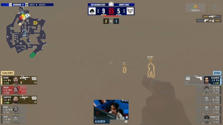 第14局X队强起,绿龙带包打A下包,Alkaren银行沙鹰一发爆头带走donk,X队五人保枪,绿龙9-5X队。