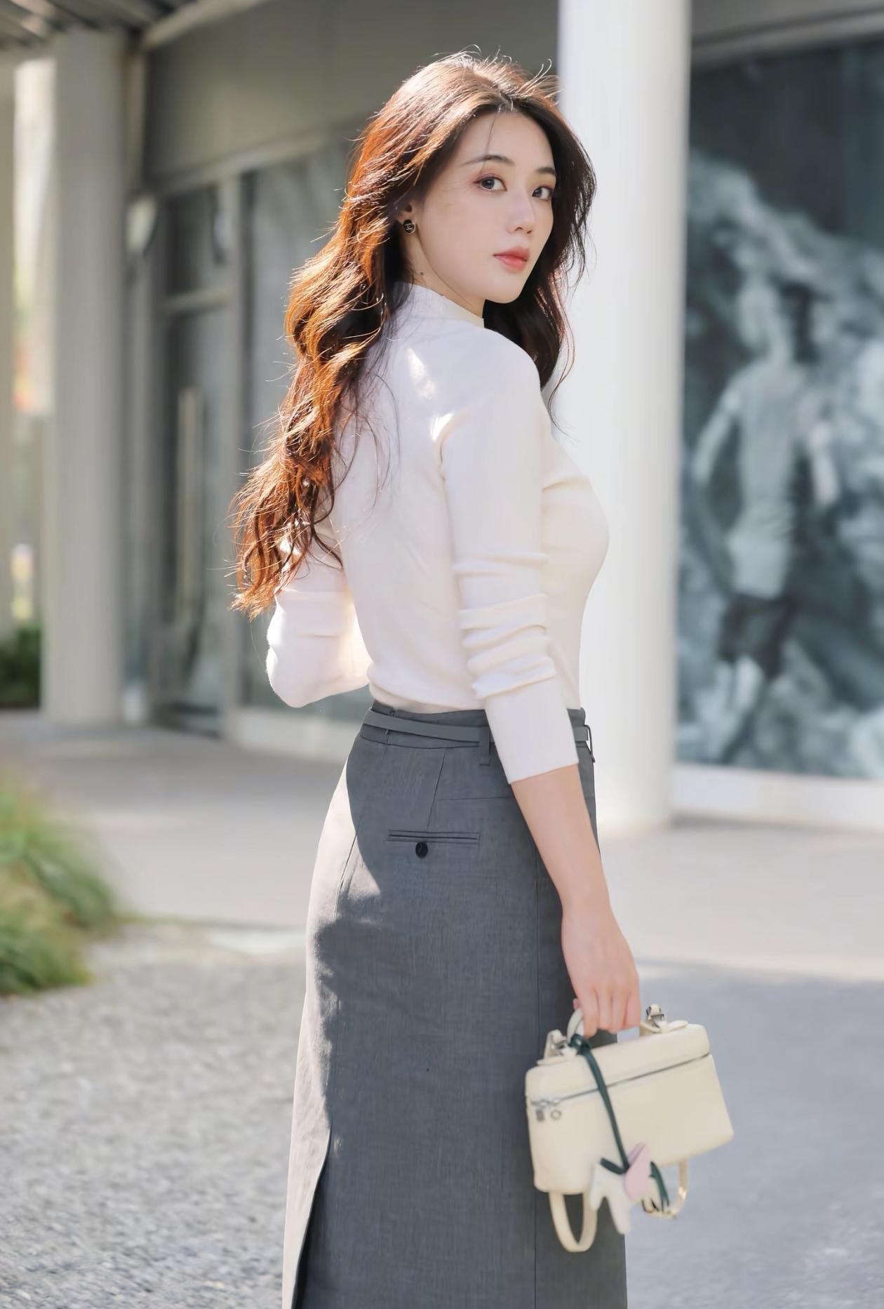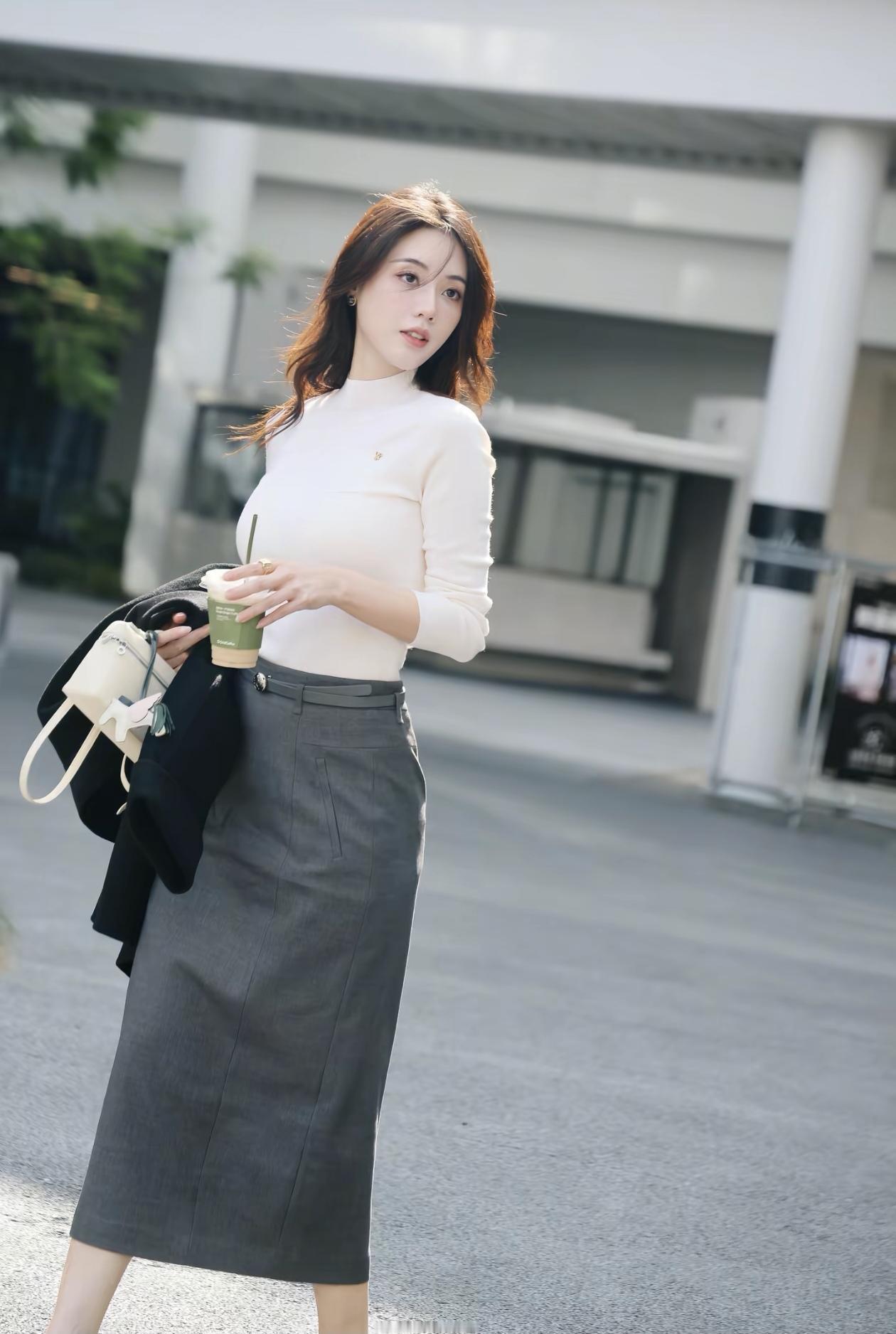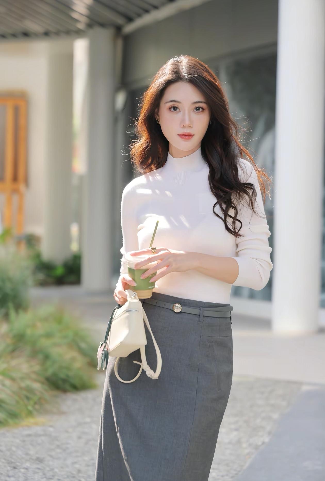 优雅都市风,白高领毛衣搭配灰色半身裙,手拿咖啡,漫步在现代建筑旁。