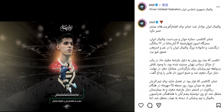 萨贝尔·卡泽米,伊朗排球年轻的国手,于今日凌晨(星期三,11月5日)去世,年仅27岁。伊朗排球大家庭陷入了深深的悲痛之中。
