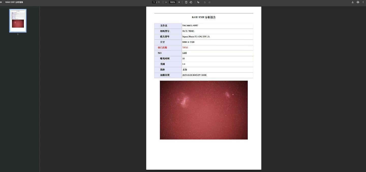 我的个人网站新增快门数查询功能页面啦~为方便你们查询快门数,我顺便给我的个人网站更新了一个快门查询功能网页(免费)~ 有需要的小伙伴可以到个人中心的数据分析,上方的快门查询页面上传照片查询哦[让我看看][让我看看] 还可以一键导出PDF报告~ 目前支持索尼,佳能老单反的一直获取不到快门数信息,以后再看。尼康的没用过没有Raw原图测试,正常来说应该可以~