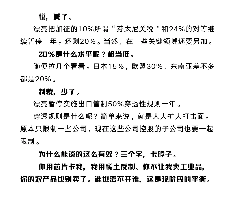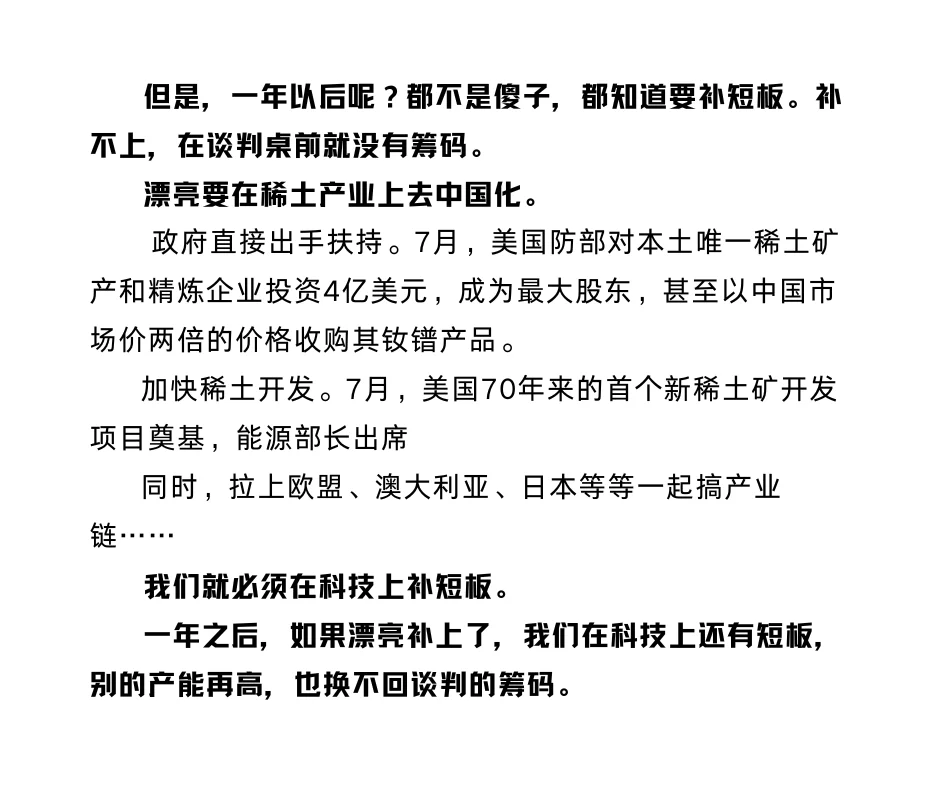 你用芯片卡我,我用稀土反制。你不让我卖工业品,你的农产品也别卖了。谁也离不开谁,这是现阶段的平衡。