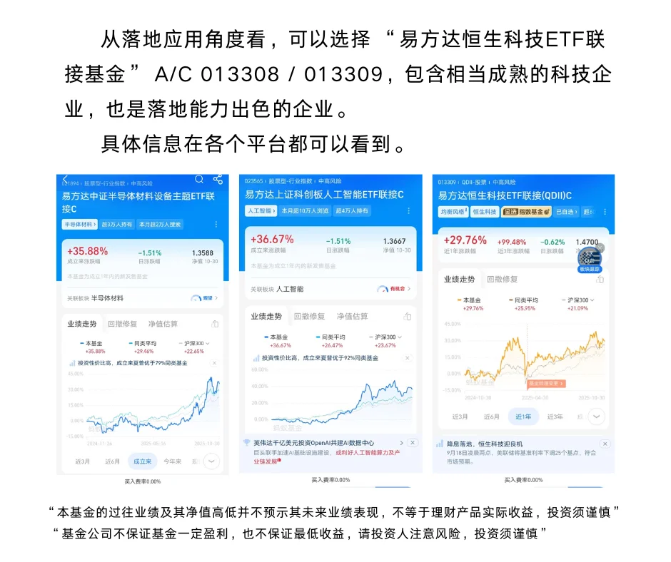 从落地应用看,可以选“易方达恒生科技ETF联接基金” A/C 013308 / 013309,包含相当成熟的科技企业,落地能力出色。