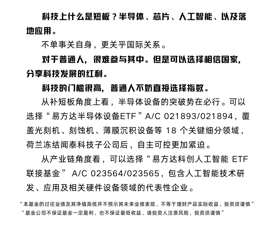 从补短板上看,半导体设备的突破势在必行。可以选“易方达中证半导体设备ETF”A/C 021893/021894,覆盖光刻机、刻蚀机、薄膜沉积设备等 18 个关键细分领域,荷兰冻结闻泰科技子公司后,自主可控更加紧迫。