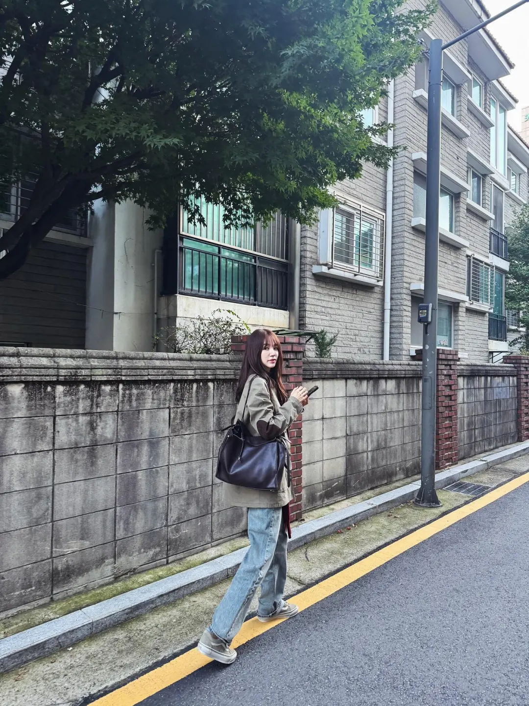 街头偶遇一位女士,米白交叉针织衫配浅蓝牛仔裤,脚踩米色高筒靴,简约又时尚,尽显都