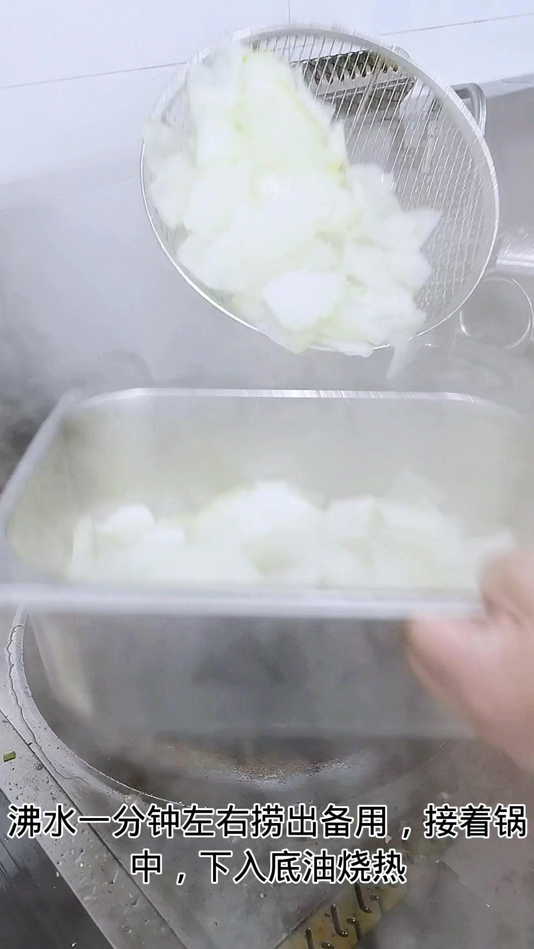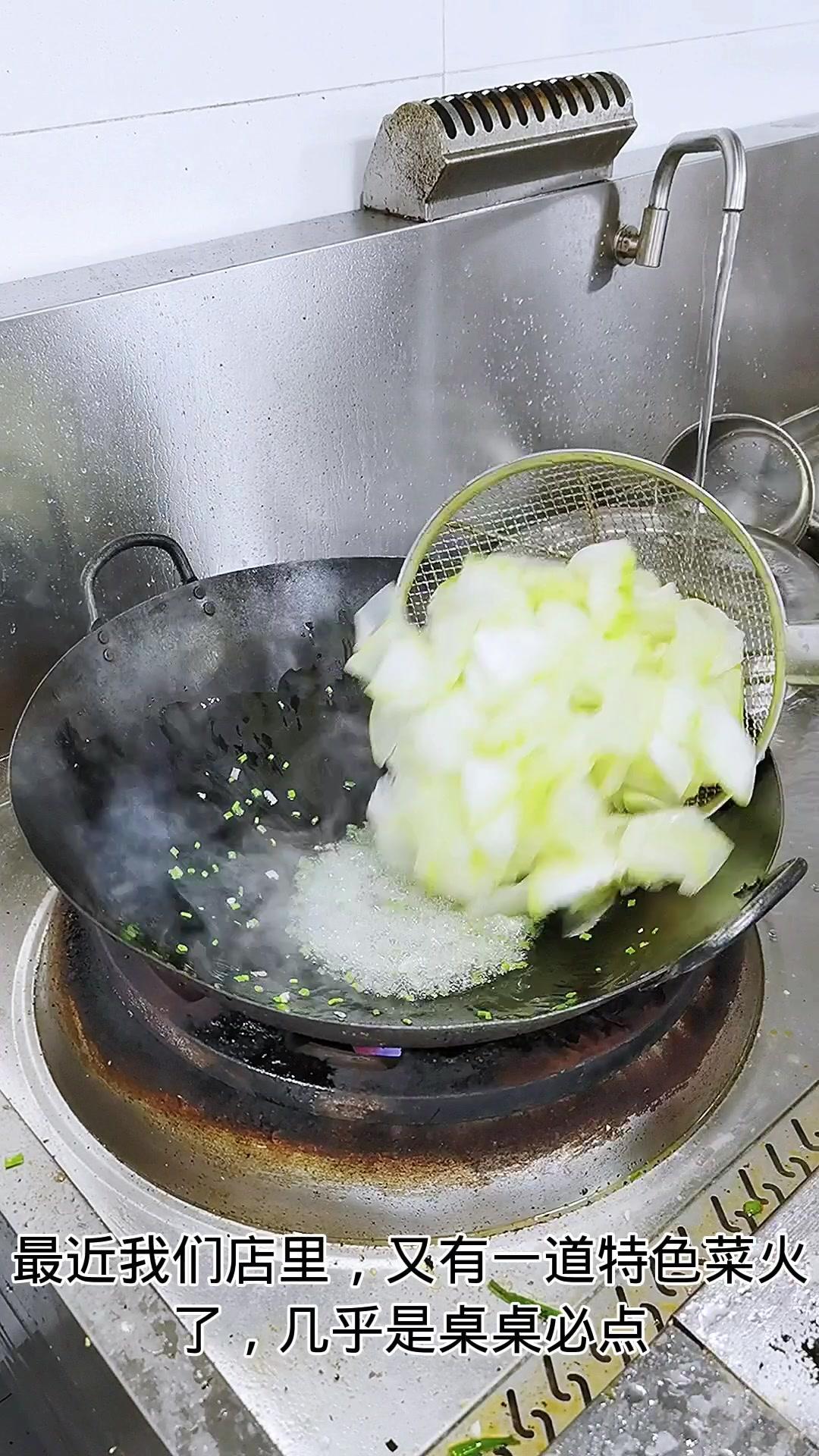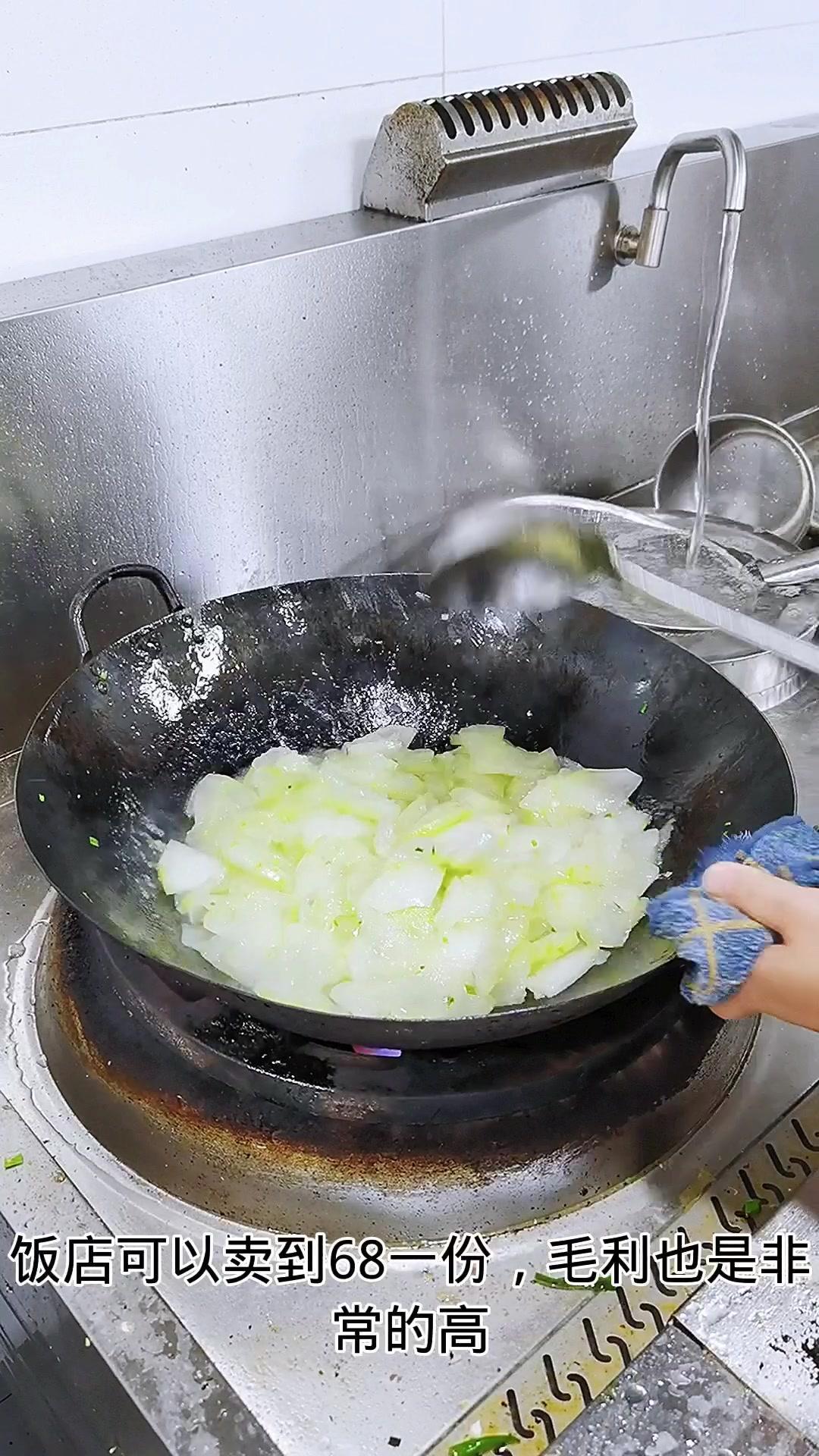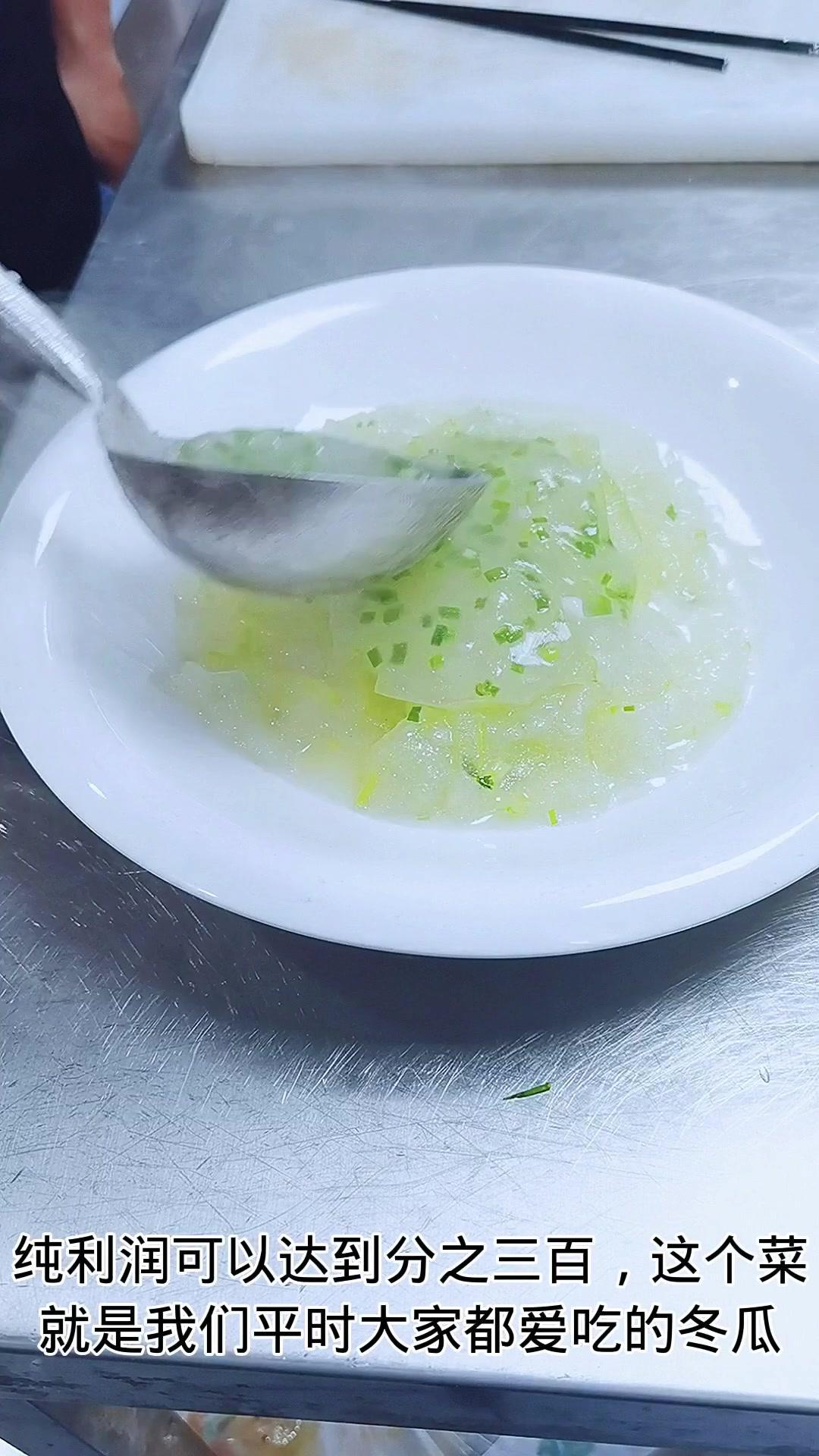 🥘店里最近又火了一道特色菜,几乎桌桌必点,这道菜成本非常低,不到1元,饭店可以卖到68元一份,毛利非常高,纯利润可以达到30%,大家爱吃的冬瓜,做梦也没梦见冬瓜可以做的这么好吃,今天一起看看这道菜是怎样操作的。 1️⃣锅中下入免费的自来水,下入切好的冬瓜,沸水1分钟,去掉冬瓜的生腥味,捞出备用。 2️⃣锅中下入底油烧热,下入一勺葱花,爆出葱香味,下入沸好水的冬瓜,翻炒5-8下,调味,下入盐把握好咸淡,下入鸡精增鲜,下入味精提鲜,翻炒均匀,将所有的调味料全部化开,融入到菜里。 3️⃣勾入一勺水芡粉,让冬瓜的表面全部挂上汤汁,才会更加滑嫩,下入一勺底油、一勺葱花,爆出葱香味,下入一勺自来水,下入盐、鸡精和味精,快速搅拌,大火烧开,勾入一勺水芡粉,继续不停搅拌,让汤汁变得更加浓稠,勾入一勺明油,增加亮度,出锅淋入冬瓜。 😋葱油冬瓜,葱香味也非常的浓郁,还特别下饭,大家觉得3毛钱一斤的冬瓜,这种别具一格的做法摇身一变68一份,你会点这道菜吗?