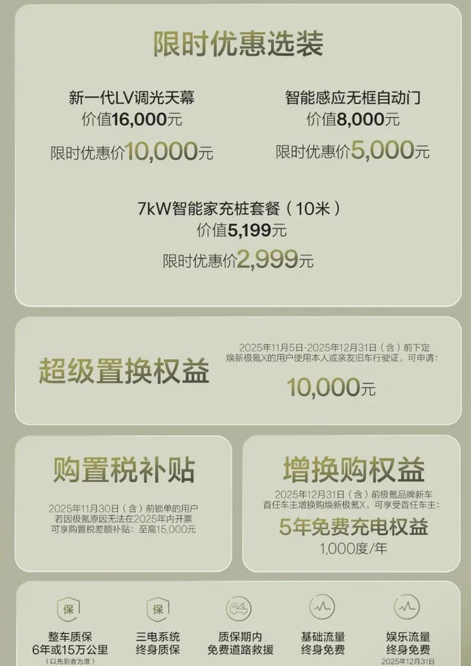 焕新极氪X限时售价14.58万起,焕新内容和之前的几位选手差不多,三电升级,3秒级小钢炮,而且加量不加价,智能感应无框自动门、14.6英寸电动滑移智慧屏、新一代LV调光天幕、电动翻折后排座垫、4D零重力座椅、智能控温中岛冰箱,科技精致6件套。推荐Max五座版,入门配置就挺高,61度大电池续航530km,15分钟快充从10%到80%,日常通勤毫无压力。【来自懂车帝车友圈】