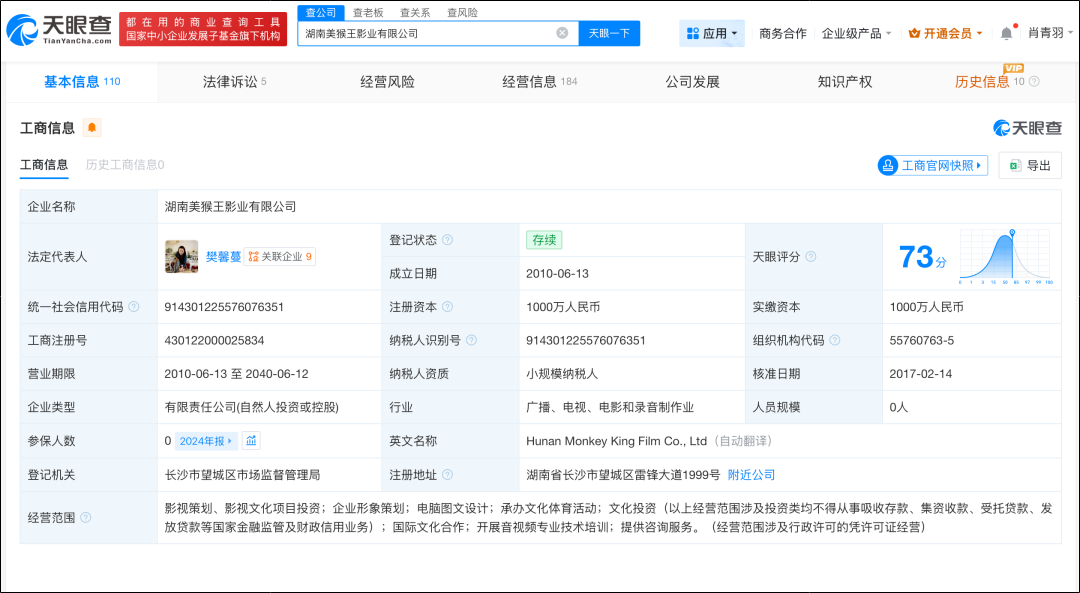 天眼查App显示,湖南美猴王影业有限公司成立于2010年6月,法定代表人、董事长为张纪中前妻樊馨蔓,张纪中任董事、总经理,注册资本1000万人民币,经营范围包括影视策划、影视文化项目投资等。