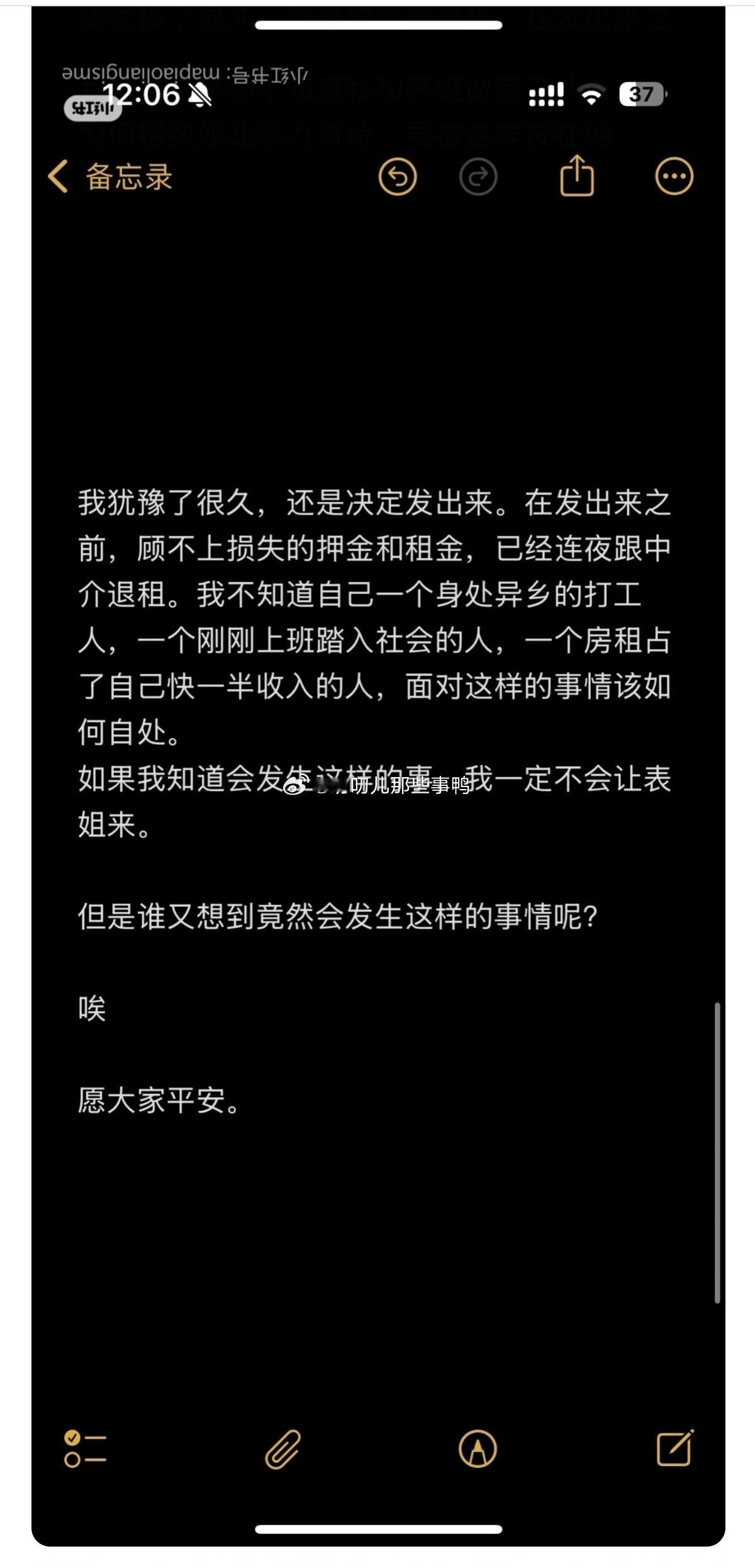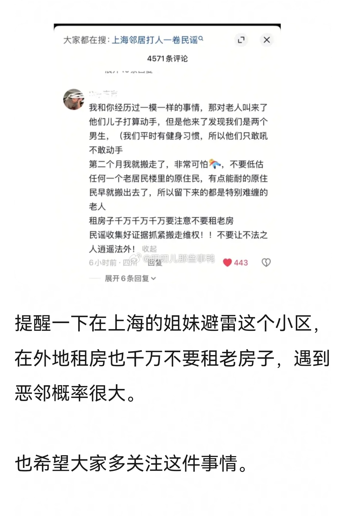 db生活组看到的帖子→上海🈶女生被邻居围殴,提醒一下在上海的姐妹避雷这个小区,在外地租房也千万不要租老房子,遇到恶邻概率很大。[怒][怒]