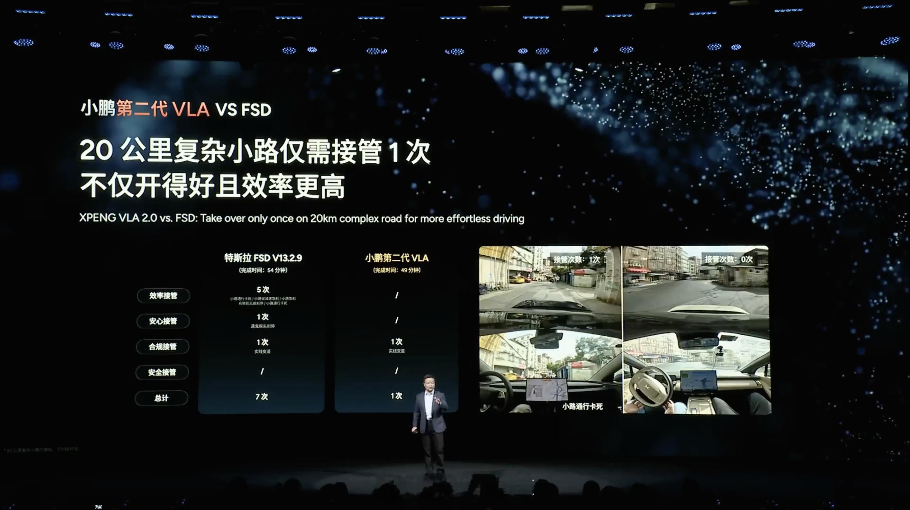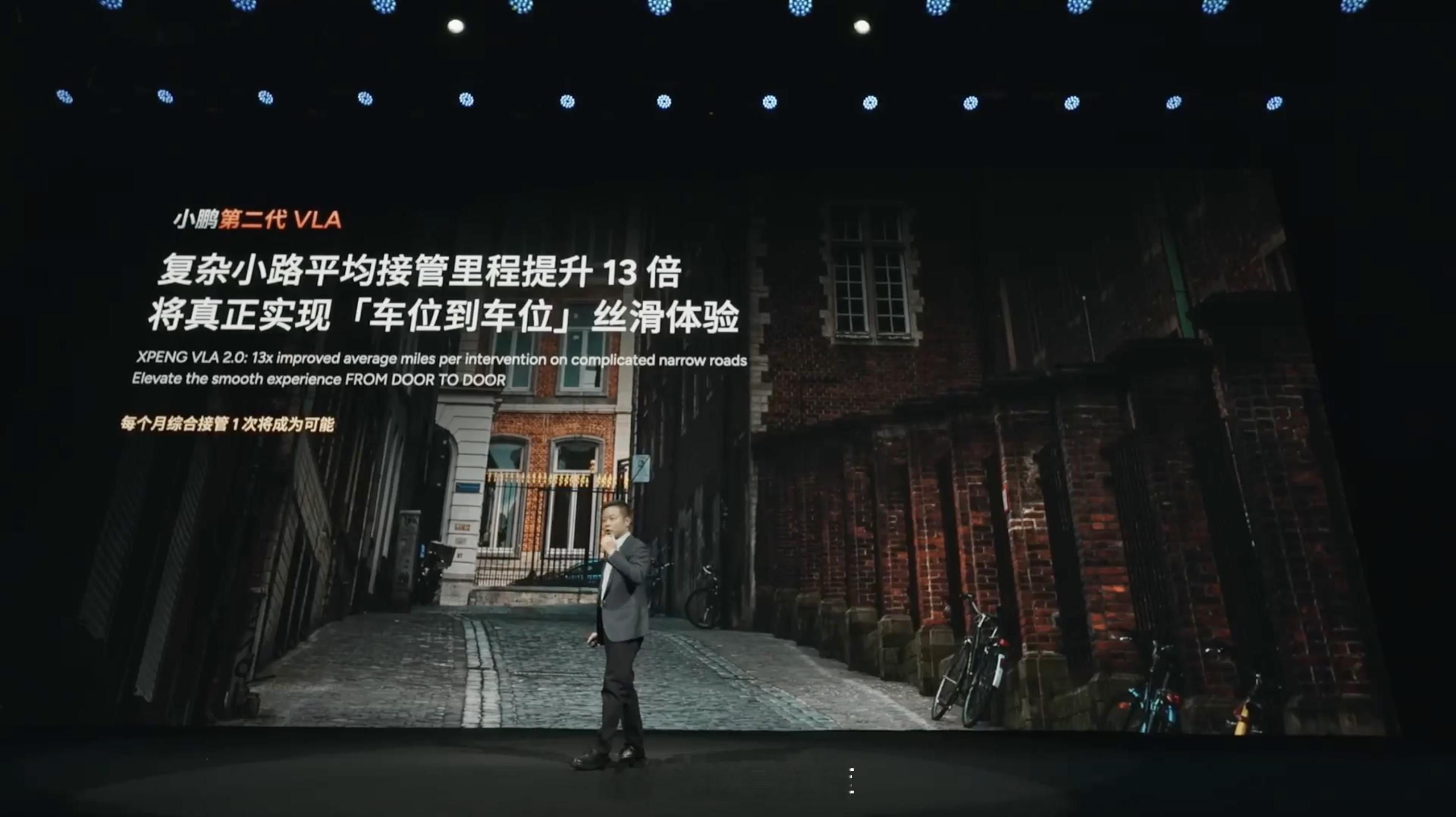 - 小路 NGP,贯通高速-城市-小路/园区。复杂小路平均接管里程提升 13 倍,实现车位到车位的丝滑体验(比如现在20 km 接管一次,以后是 260 km 接管一次),对比 FSD V13.2.9 表现很好。何小鹏:下个月去美国体验 FSD V14。