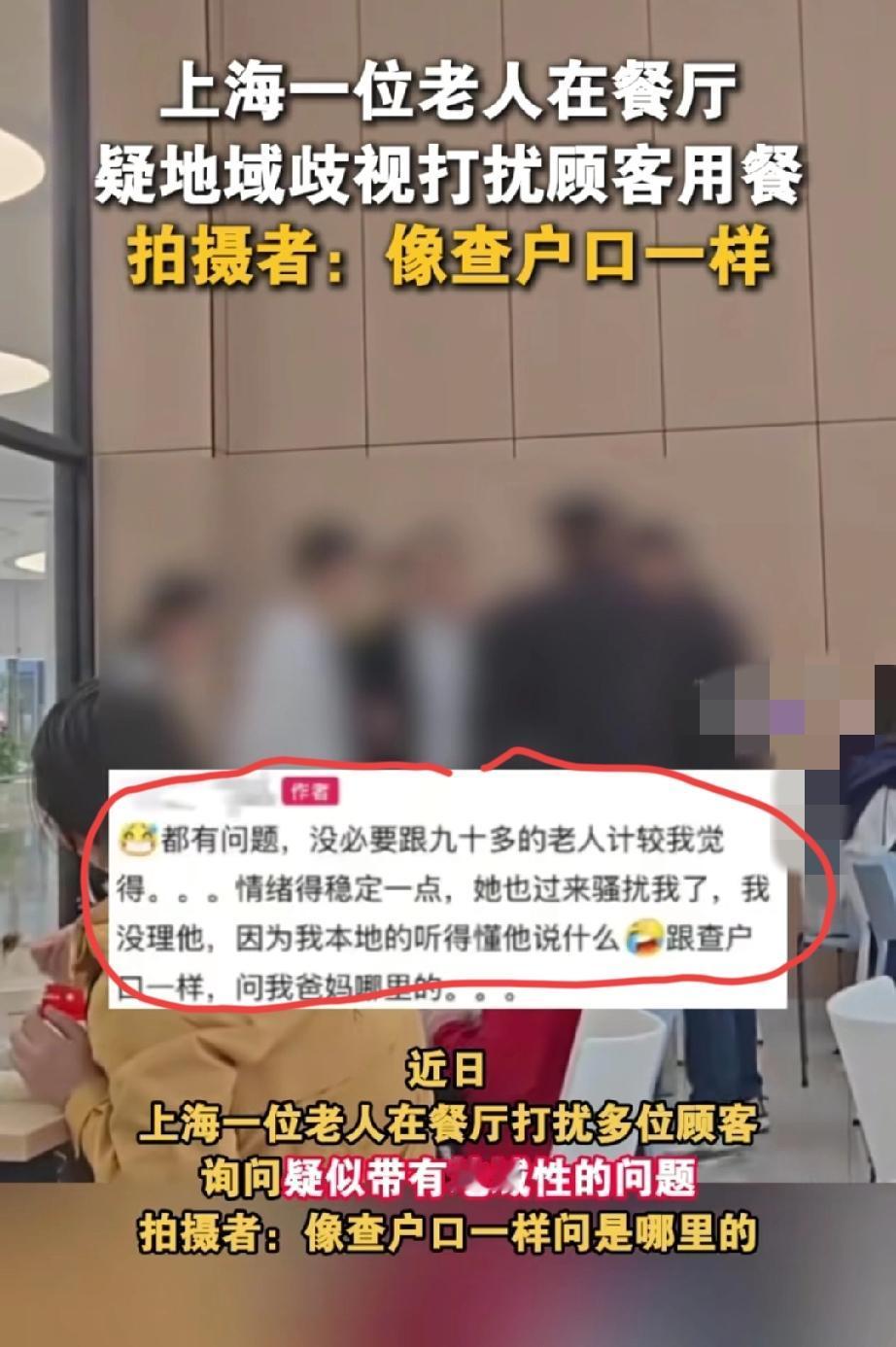 上海一餐厅内,老人打扰多位顾客用餐,询问带有地域性的问题。一年轻小伙秉不住了,跳出来表示:“我就是外地人,怎么啦”,餐厅工作人员和其他顾客则是在安抚双方…… 拍摄者称:像查户口一样,问我爸妈是哪里的?双方都有问题,没必要跟岁数这么大的老人计较,不要理睬她就可以了。 视频发布者说的一点没错,可能这位老人就是老年痴呆了,人家又伤害不到你,何必跟这样的老人斤斤计较呢?可以让餐厅工作人员把他请出去嘛,干嘛跟他起正面冲突,这种事情上年轻人讨不到一点好处。做人做事还是要与人为善!!! 各位看官,你们说是不是这个道理?