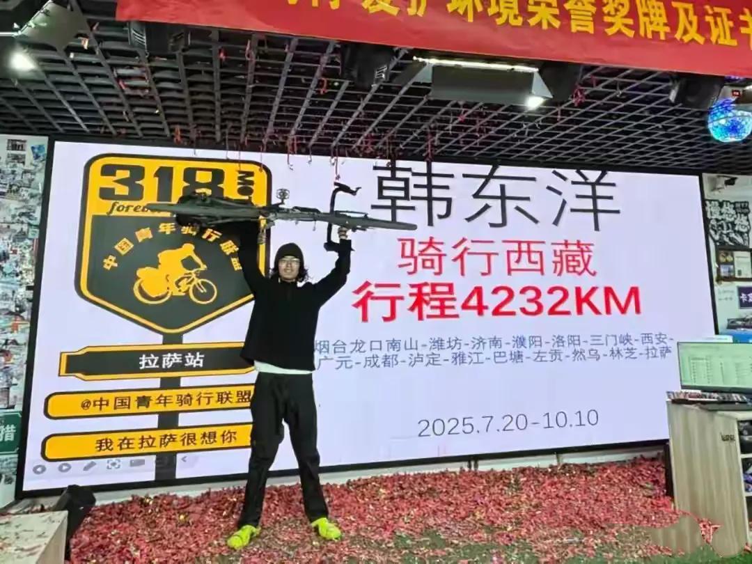 烟台龙口,一位姓韩的小伙子干了一件了不起的事情,他用83天的时间,骑着自行车,从龙口到达拉萨,行程达4200多公里。 这从画面看,小韩穿着一身骑行服,身体瘦高,他对着镜头竖起了大拇指,这是对他自己的点赞。 据小韩说,他在十年前就有这个想法,一直没有成行,今年,他29岁了,终于实现了这个梦想,自己也是非常的开心。 83天骑行4200多公里,平均一天就要骑行50多公里,这运动量,不是一般的体能能够承受的。 而且这一路,还会遇到不好的天气,能够坚持下来,真的需要特别顽强的意志力。 长途骑行,既考验耐力,又考验技术,不是一拍脑袋,就能够完成的任务。为了实现这个梦想,小韩也进行了长期的准备和训练,并且为此辞掉了工作。 在佩服小韩的同时,我们也要理性看待这件事情,不是什么人都能这样想走就走的,应该量力而行! 小韩目前已经回到龙口的家,他还打算继续骑行,海岛、林海、湖滨,都会成为他骑行的下一个目标,为他加油!