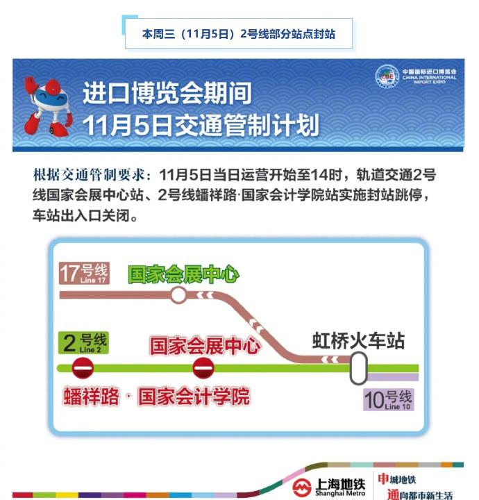【上海2号线这些地铁站实施封站跳停 本周三2号线国家会展中心站、蟠祥路·国家会计学院站封站至下午2点】根据交通管制要求:11月5日当日运营开始至14时,轨道交通2号线国家会展中心站、2号线蟠祥路·国家会计学院站实施封站跳停,车站出入口关闭。需前往国家会展中心的乘客可到17号线国家会展中心站下车。详见↓聚焦2025进博会进博会国家会展中心交通攻略 上海超话上海