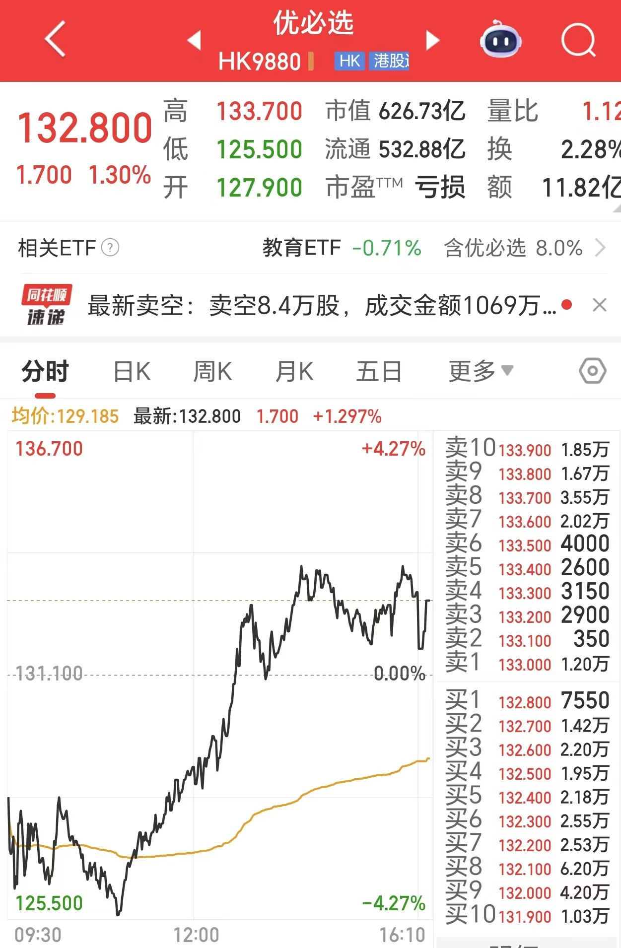 11月5日,优必选股价一度大跌4.27%,午后开始拉升。截至当日收盘,该股上涨1.30%,报132.80港元/股,市值为626.73亿港元。